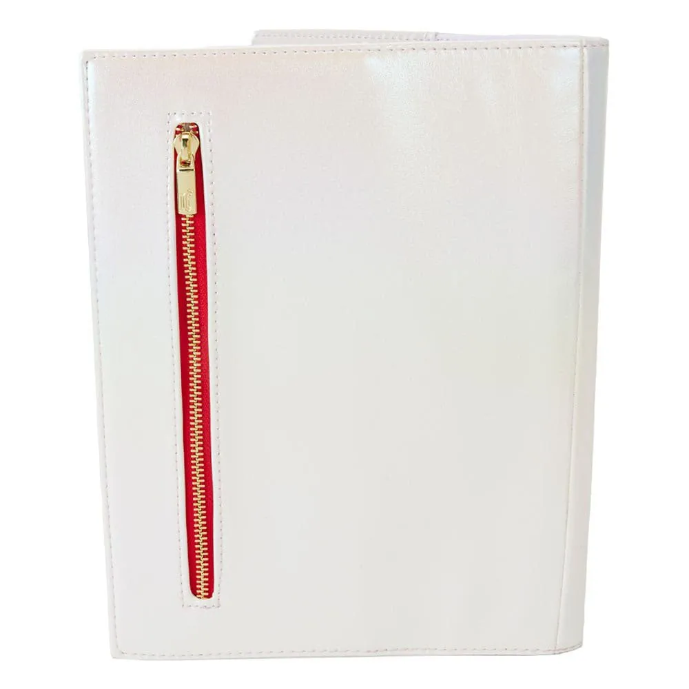 Dziennik wykonany jest ze skóry wegańskiej (poliuretan) i zawiera aplikacje, nadruki, sztuczny denim i perłowe detale, a także wytrzymałe złote okucia metalowe