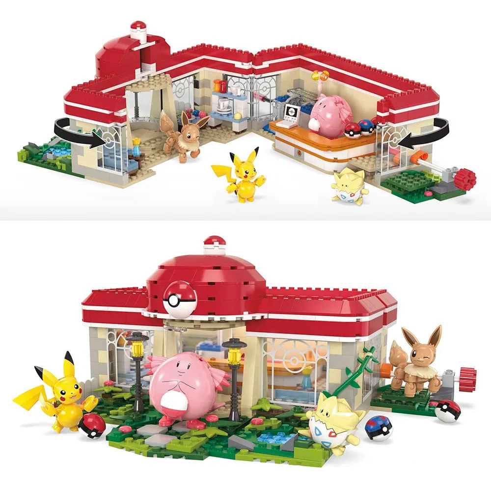 Witamy w Strefie Obsługi Pokémon! To kultowe miejsce jest teraz zestawem do budowania, który zawiera cztery znane postacie: Pikachu, Chansey, Eevee i Togepi.
