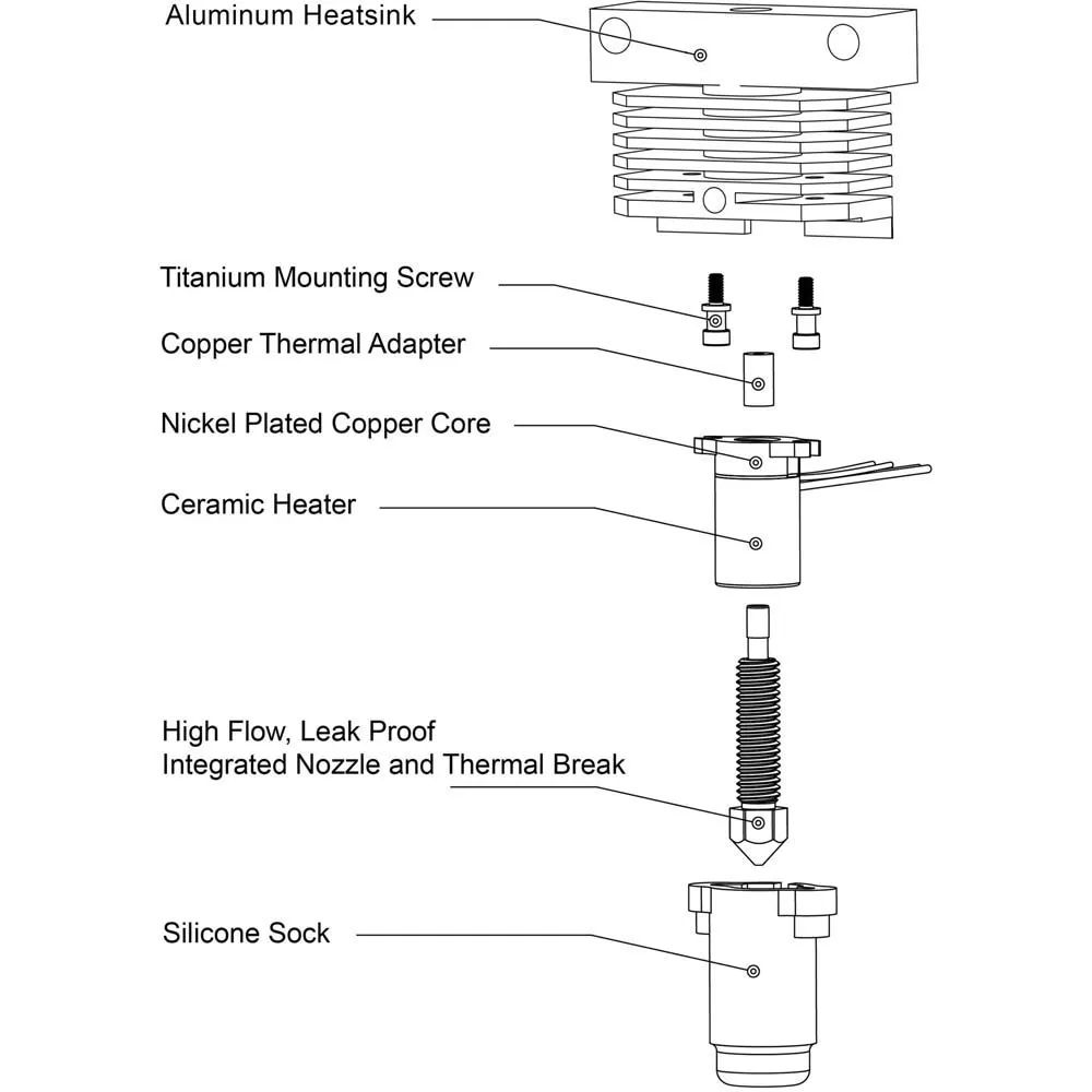 Dysza FlowTech ma całkowicie metalową konstrukcję, która poradzi sobie z większością nowoczesnych filamentów do druku 3D.