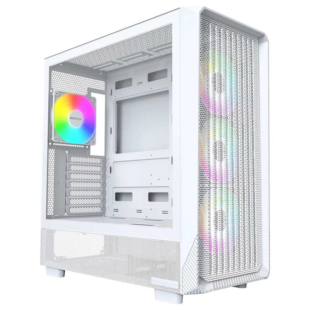 MONTECH X5 - Obudowa PC typu Mid-Tower ATX dla graczy, wysoki przepływ powietrza, 3 wentylatory ARGB 140 mm i 1 wentylator ARGB 120 mm preinstalowane, szklany panel boczny, akcenty z nadrukiem karbonowym, uchwyt na kartę graficzną w zestawie, biała.