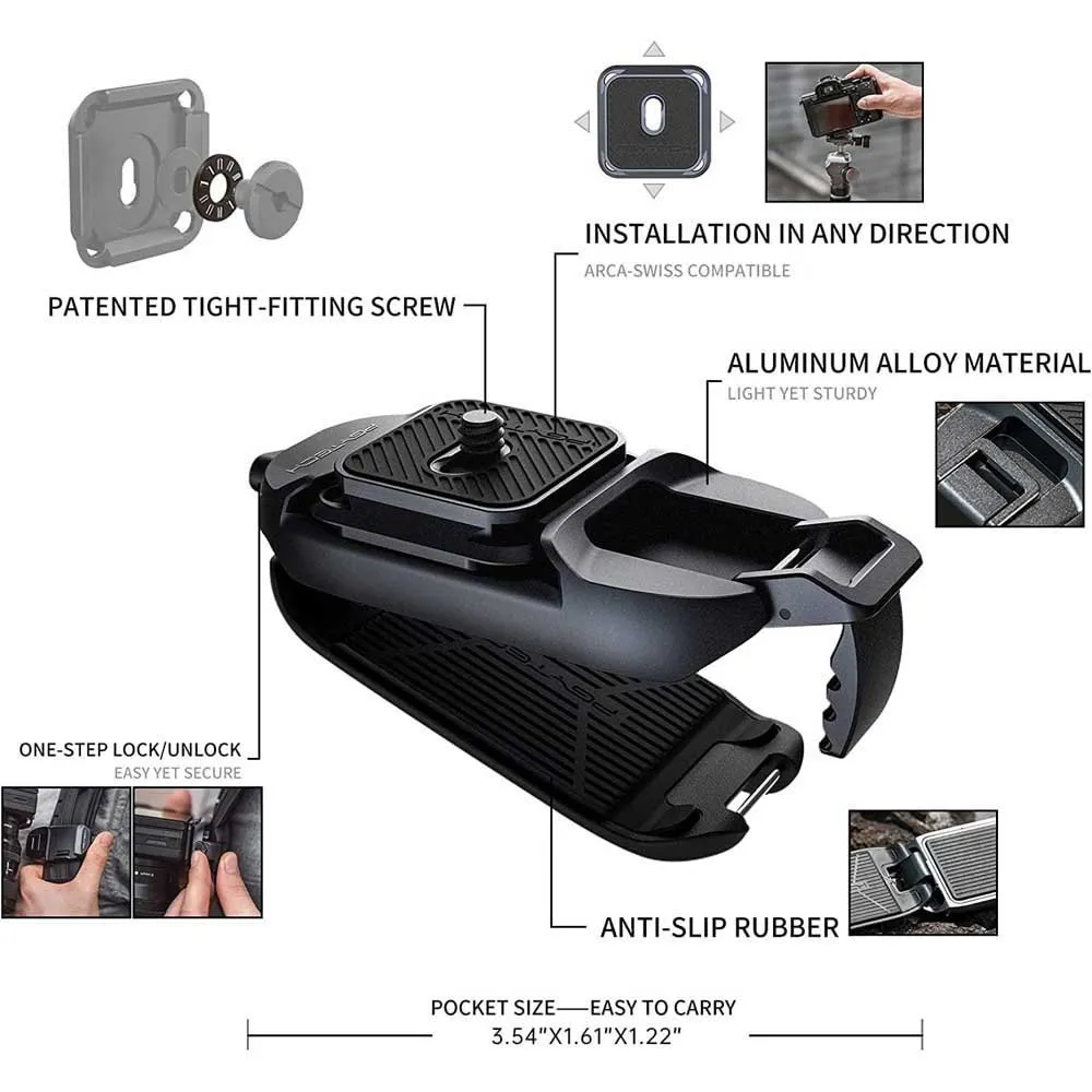 Klips do aparatu PGYTECH P-CG-040 w kolorze czarnym to wygodne i wszechstronne akcesorium dla fotografów i filmowców. Ten klips bezpiecznie mocuje się do paska lub paska plecaka, umożliwiając łatwe przenoszenie aparatu w podróży. Klips jest wykonany z wysokiej jakości materiałów i posiada mechanizm szybkiego zwalniania, zapewniający szybki i łatwy dostęp do aparatu. Zawiera również mocowanie śrubowe 1/4" do mocowania różnych akcesoriów do aparatu. Ten klips do aparatu to niezbędny element wyposażenia dla każdego, kto chce, aby jego aparat był bezpieczny i łatwo dostępny podczas przygód na świeżym powietrzu lub sesji zdjęciowych.