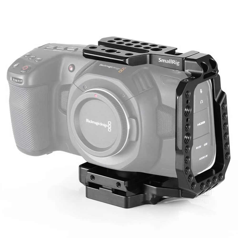 SmallRig QR Half Cage do Blackmagic Design Pocket Cinema Camera 4K i 6K (stara wersja) CVB2255 to klatka dopasowana do kształtu. Posiada płytkę Manfrotto 501PL w klatce, umożliwiającą szybkie zwolnienie aparatu w ciągu 2 sekund i przejście do statywów kompatybilnych z Manfrotto 501PL. Jest bezpiecznie blokowany śrubą 1/4'' 20 na spodzie, z dodatkowymi kołkami ustalającymi i gumowymi podkładkami, aby zapobiec drganiom i zadrapaniom. Na górze i po lewej stronie wbudowane są szyny NATO, do których można przymocować górny uchwyt NATO SmallRig 1955 i drewniany uchwyt boczny NATO 2187 SmallRig w celu prowadzenia strzelania z ręki. Wiele punktów mocowania, takich jak otwory gwintowane 1/4'' 20 i 3/8''16, stopka zimna i otwory ustalające ARRI są idealne do mocowania akcesoriów. Dla użytkowników nagrywających za pomocą SmallRig Samsung T5 SSD Mount 2245 to dobry wybór. Klatka jest kompatybilna z zaciskiem kablowym SmallRig HDMI i USB C 2246 do mocowania kabli. Współpracuje ze wspornikiem adaptera mocowania obiektywu SmallRig 2247, aby zapewnić stabilność obiektywu. Przymocuj płytkę bazową SmallRig do BMPCC 4K 2267 na dole klatki, aby zapewnić podparcie szyny 15 mm na wysokości pręta 85 mm. Klatka zapewnia swobodny chwyt aparatu, przycisk, port, wentylację i dostęp do baterii.