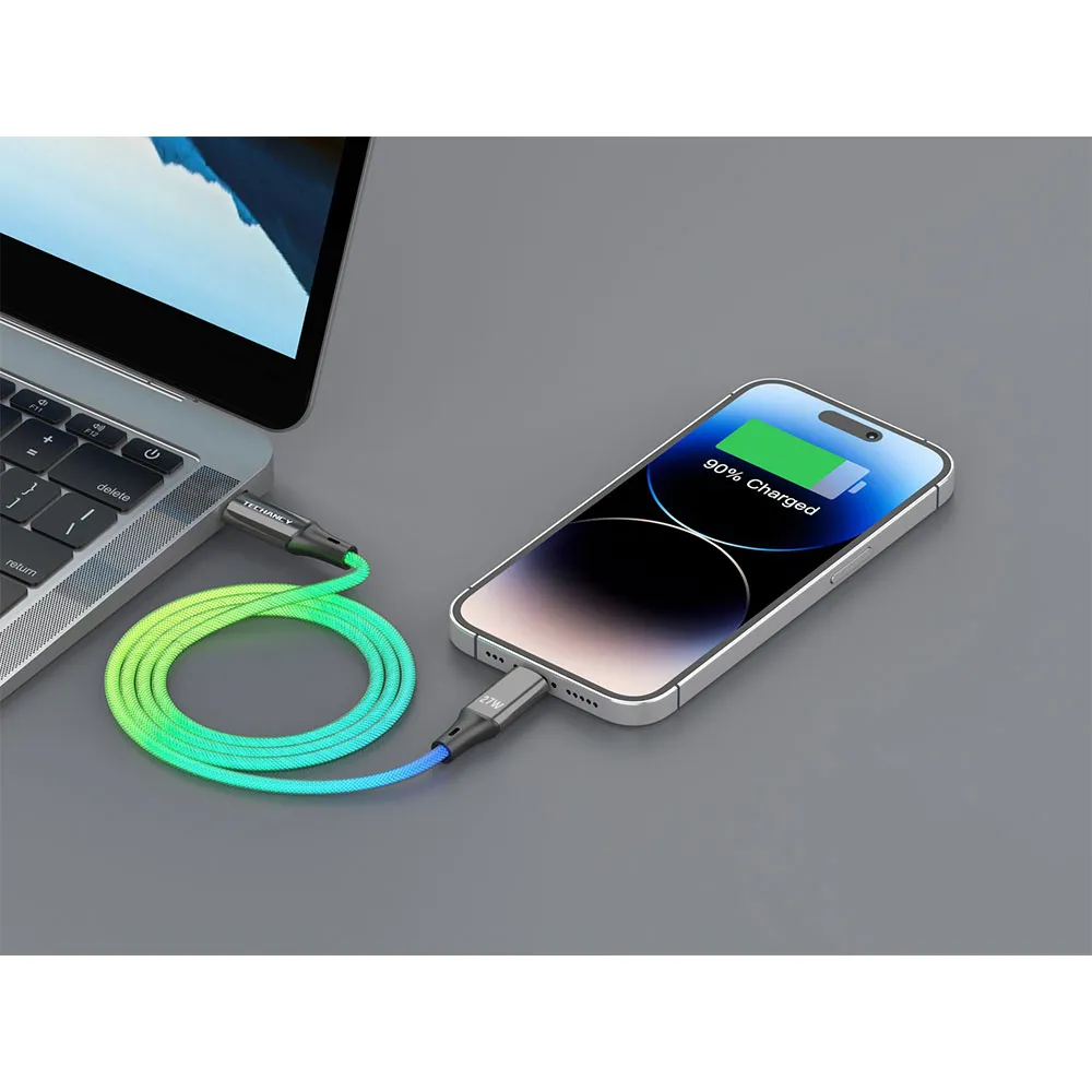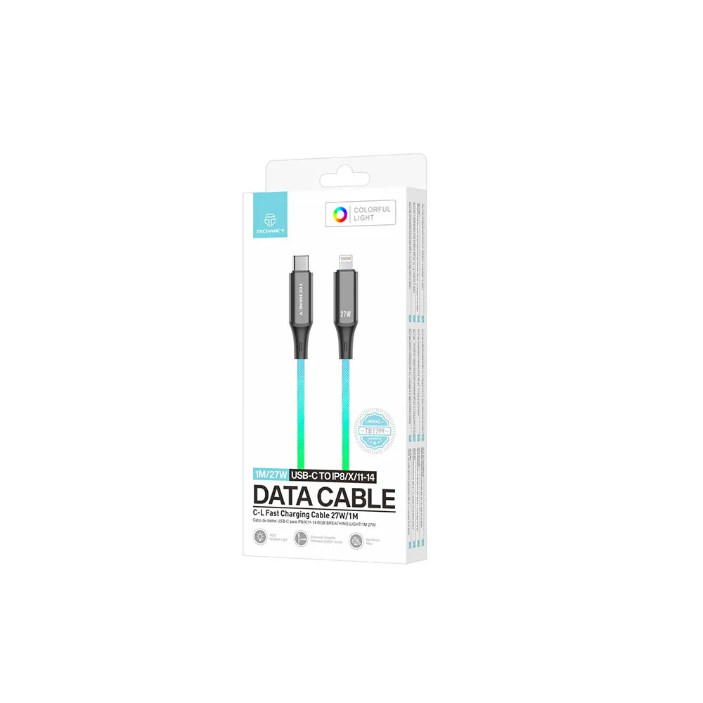 Kabel do ładowania i transmisji danych Techancy USB-C do iP8/X/11 - 14 z szybkim ładowaniem, wyposażony w olśniewające, siedmiokolorowe podświetlenie RGB. Podczas ładowania emituje barwne światło otoczenia, a wysoka prędkość transmisji umożliwia błyskawiczne przesyłanie danych, takich jak dokumenty, zdjęcia, filmy i muzyka. Ładowanie i transmisja mogą odbywać się jednocześnie.