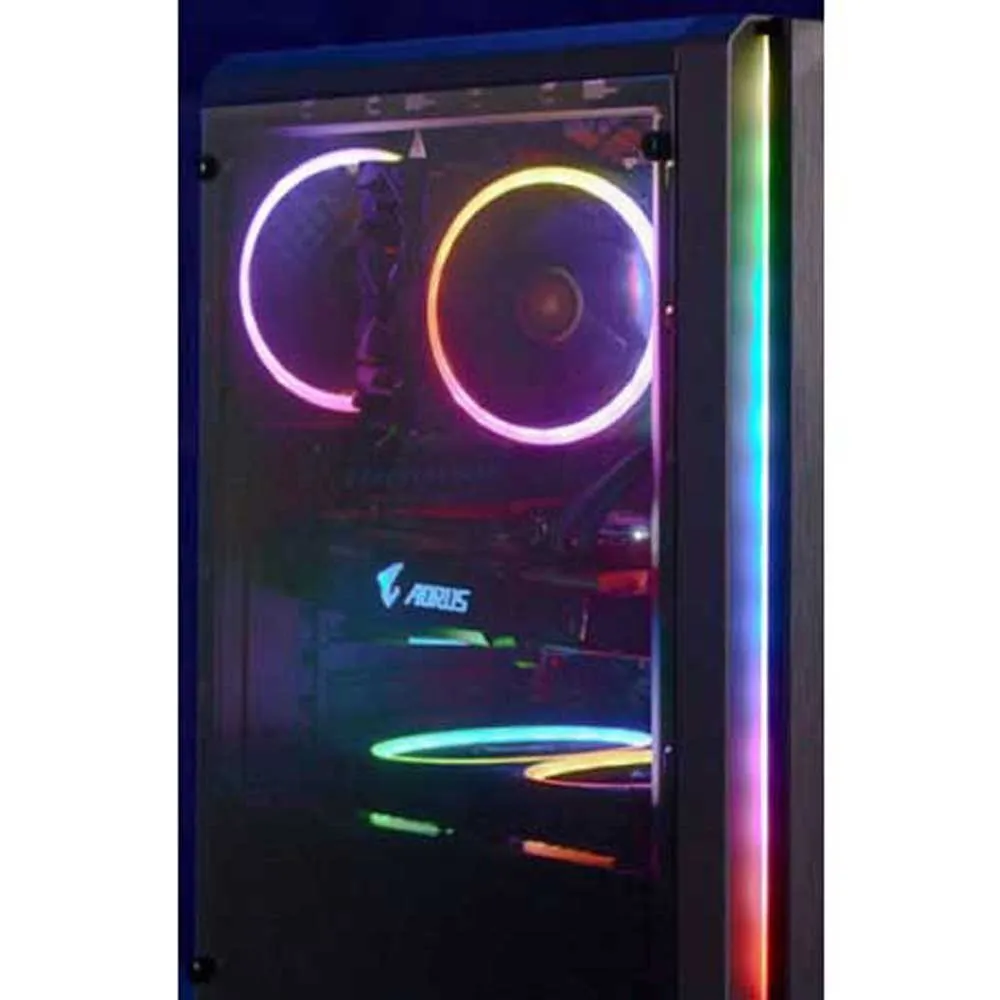 Gabinete torre média de alto desempenho com um design de painel frontal em malha para visualização clara de suas ventoinhas de LED frontais e ventilação aprimorada. O painel lateral de vidro temperado mostra o interior de seu equipamento. Vem equipado com três ventoinhas RGB endereçáveis de 12 cm na frente e uma ventoinha RGB endereçável de 12 cm na parte traseira do gabinete.