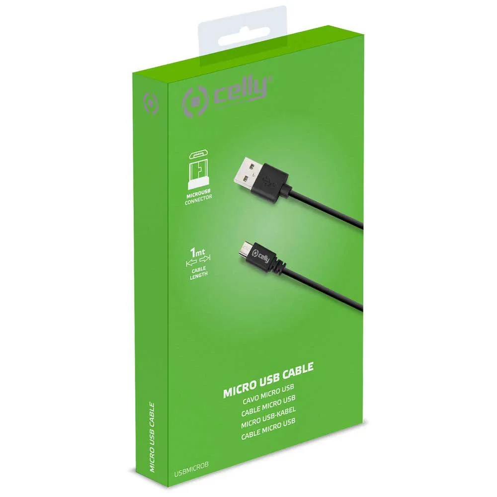Cabo de dados USB preto com conector microusb para transferência simultânea de dados e recarga da bateria. 1 metro de comprimento. Suporta carregamento rápido (2.1A) e conexões USB 2.0 de alta velocidade. Carregue, sincronize e transfira dados mais rapidamente com o Celly.