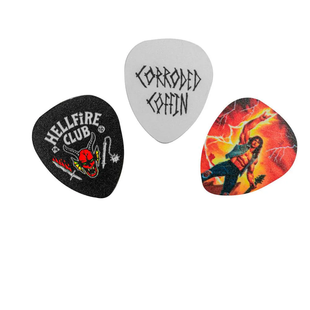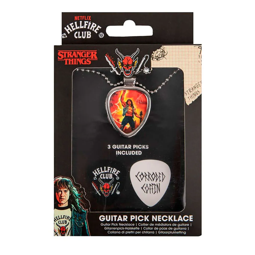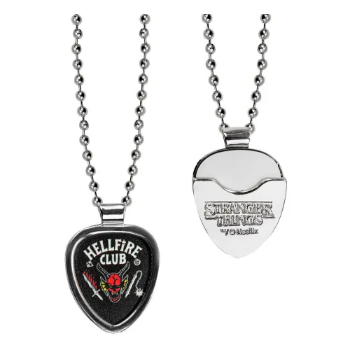 Mostre seu amor pelo metaleiro favorito de Hawkins com nosso colar exclusivo de palheta de guitarra Eddie Munson! Este acessório único vem com três palhetas de guitarra intercambiáveis que se encaixam perfeitamente dentro do suporte, permitindo que você mude seu estilo quando quiser.