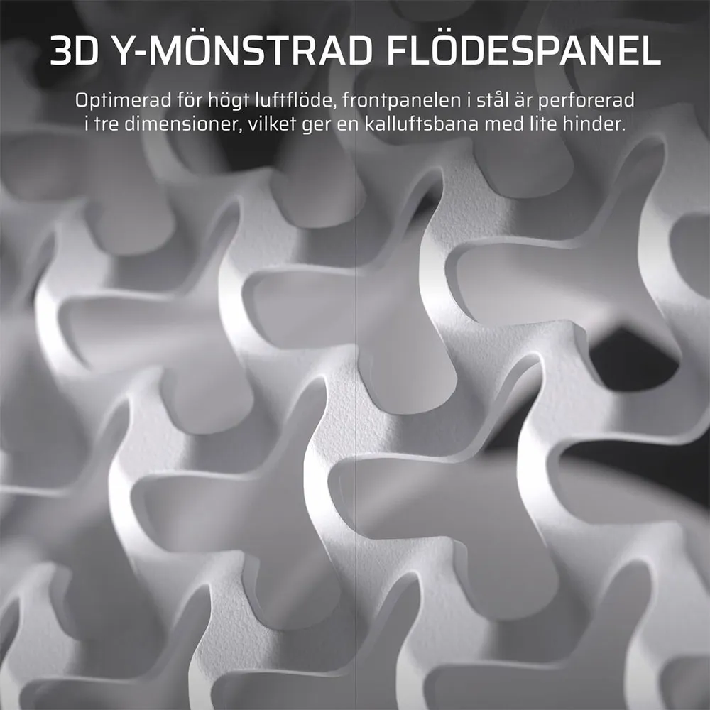 Experimente um Desempenho de Resfriamento Incomparável: O painel frontal de alto fluxo de ar, combinado com extensas montagens de ventoinhas e radiadores, cria um caminho direto para o ar frio atingir seus componentes mais quentes. Este design reduz significativamente as temperaturas do sistema, permitindo um desempenho sustentado mais alto e uma maior longevidade dos componentes.