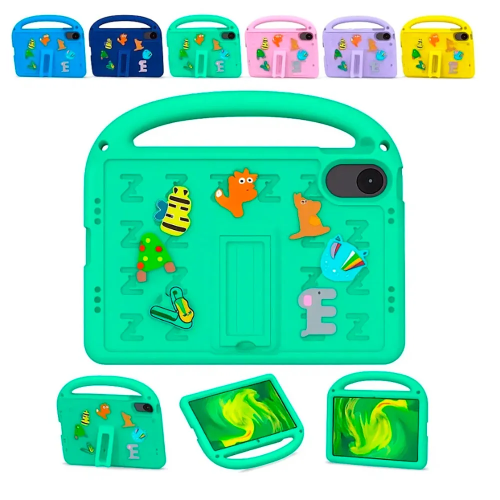 Proteja seu tablet com esta capa à prova de choque para crianças, com um design de letras e desenhos animados em azul.