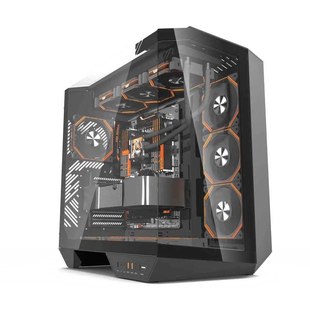 No centro do design do DY470 está seu compromisso com o gerenciamento térmico excepcional. O painel frontal de alto fluxo de ar permite que grandes quantidades de ar frio sejam aspiradas para dentro do chassi, resfriando diretamente seus componentes mais críticos. Este gabinete é uma potência de resfriamento, oferecendo amplo suporte para uma variedade de configurações de ventoinhas e radiadores. Monte até três ventoinhas de 120 mm na frente ou opte por um radiador de resfriamento líquido maciço de 360 mm para controle térmico máximo da CPU. Montagens de ventoinhas adicionais na parte superior e traseira garantem um caminho de exaustão contínuo e eficiente, evitando o acúmulo de calor e mantendo o desempenho máximo durante sessões de jogos intensas ou cargas de trabalho pesadas.