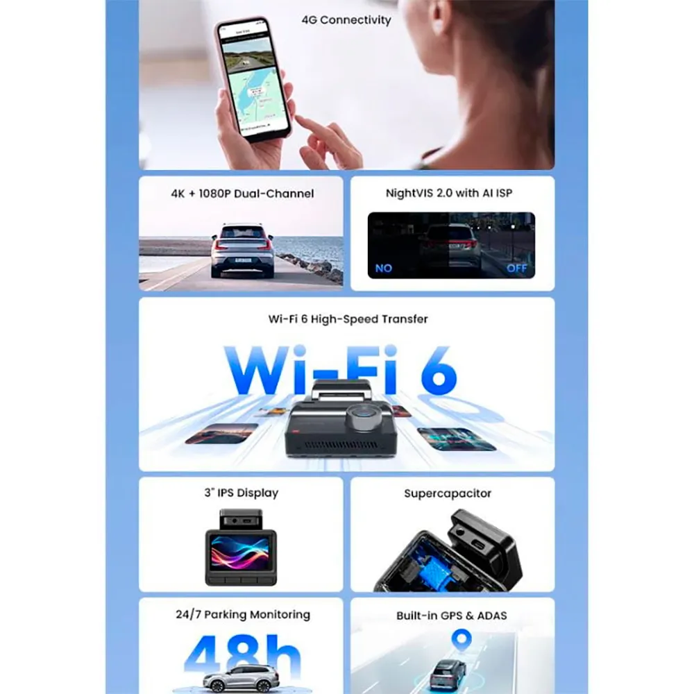 Incorpora uma tela IPS de 3 polegadas, supercapacitor e modo de estacionamento 24/7 (com fiação) para vigilância contínua.