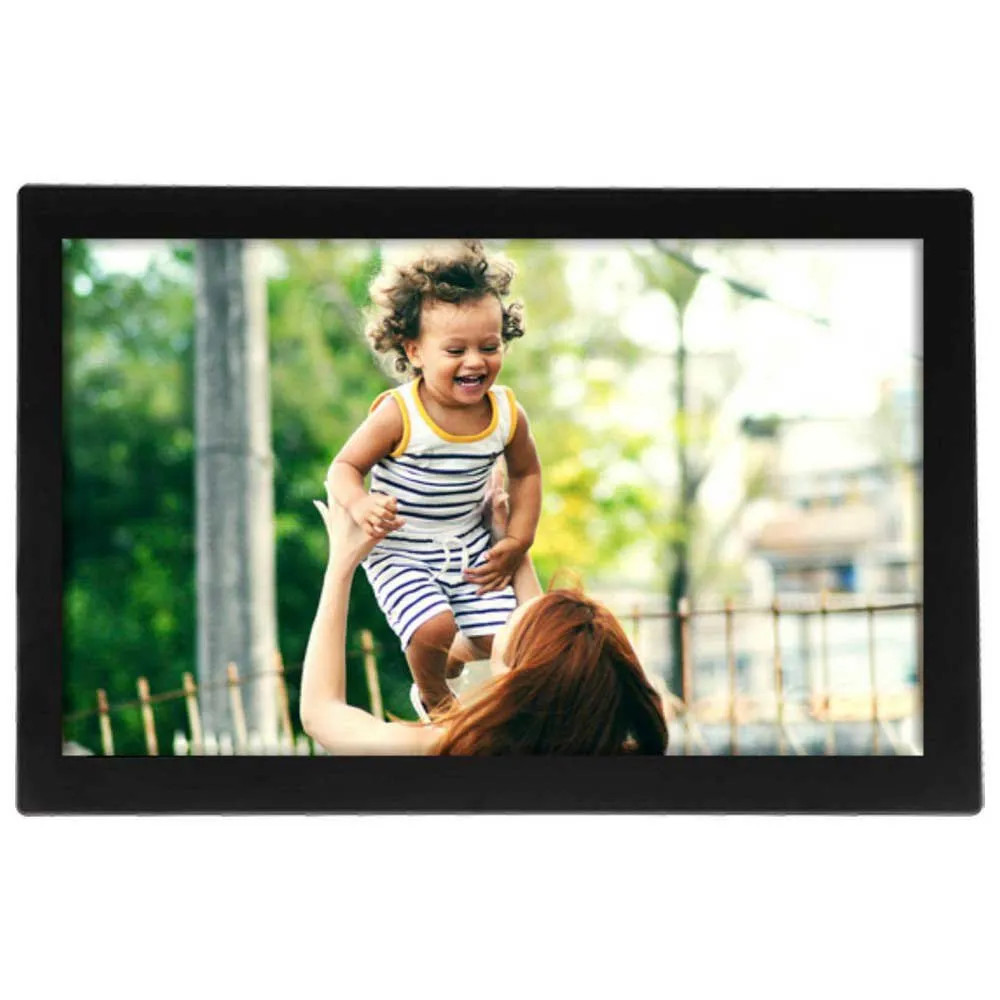 - Moldura de fotos inteligente Wi-Fi de 10.1” com tela de toque IPS e armazenamento flash de 16 GB (eMMC)