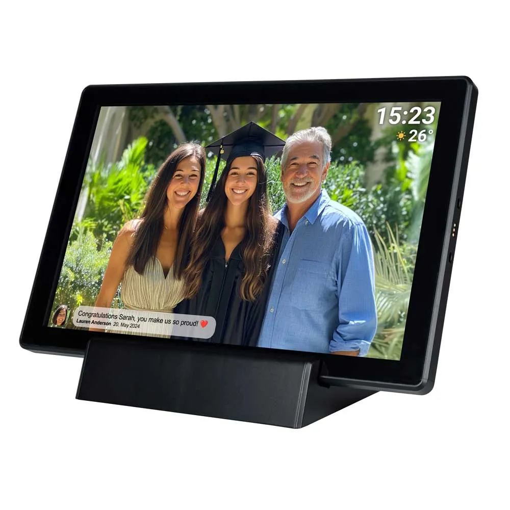 Moldura digital Wi-Fi de 10.1" com bateria recarregável integrada e software de fotos FRAMEO. Esta é uma nova maneira social de compartilhar fotos e vídeos com amigos e familiares. A tela sensível ao toque IPS HD oferece imagens nítidas e de boa qualidade.
