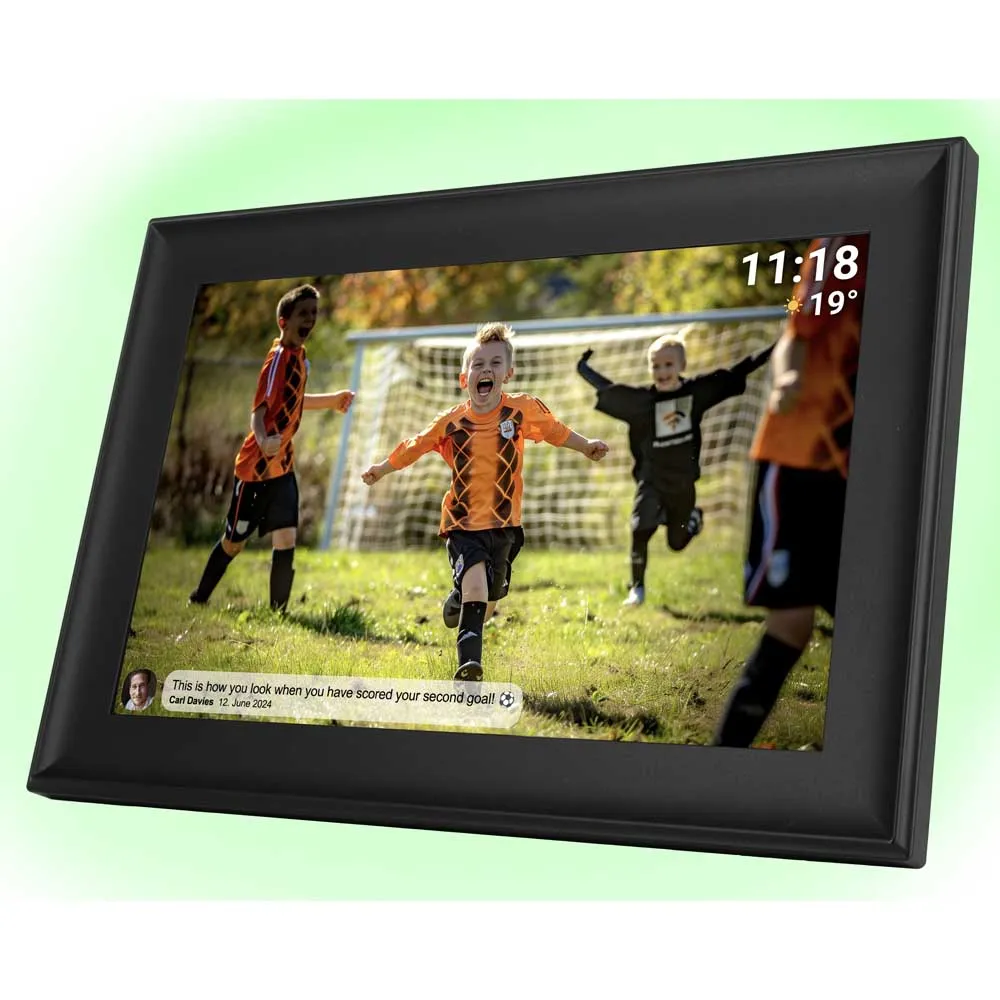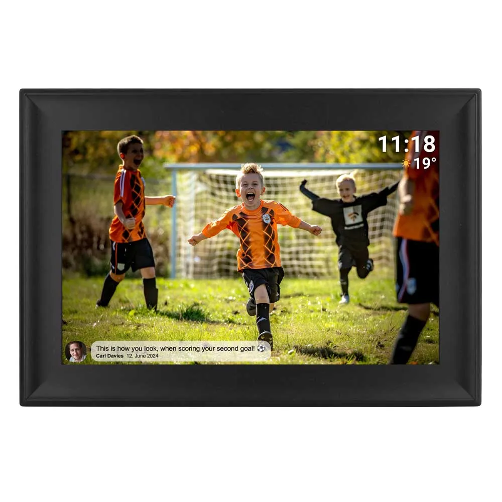 Moldura digital Wi-Fi de 10.1" com software de fotos FRAMEO. Esta é uma nova maneira social de compartilhar fotos com amigos e familiares. A tela sensível ao toque IPS oferece imagens nítidas e de boa qualidade.