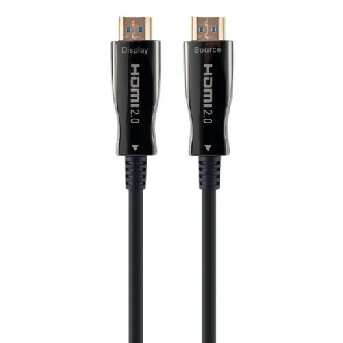 - O cabo HDMI Active Optical Cable (AOC) utiliza a tecnologia de fibra óptica para transportar o sinal HDMI digital. Isso significa que o sinal pode ser transportado muito mais longe do que com um cabo de cobre tradicional (até 100 m), e reduz o risco de interferência EMI/RFI. Os cabos HDMI AOC também possuem fios de alimentação de cobre dedicados internos, portanto nenhuma fonte de alimentação externa é