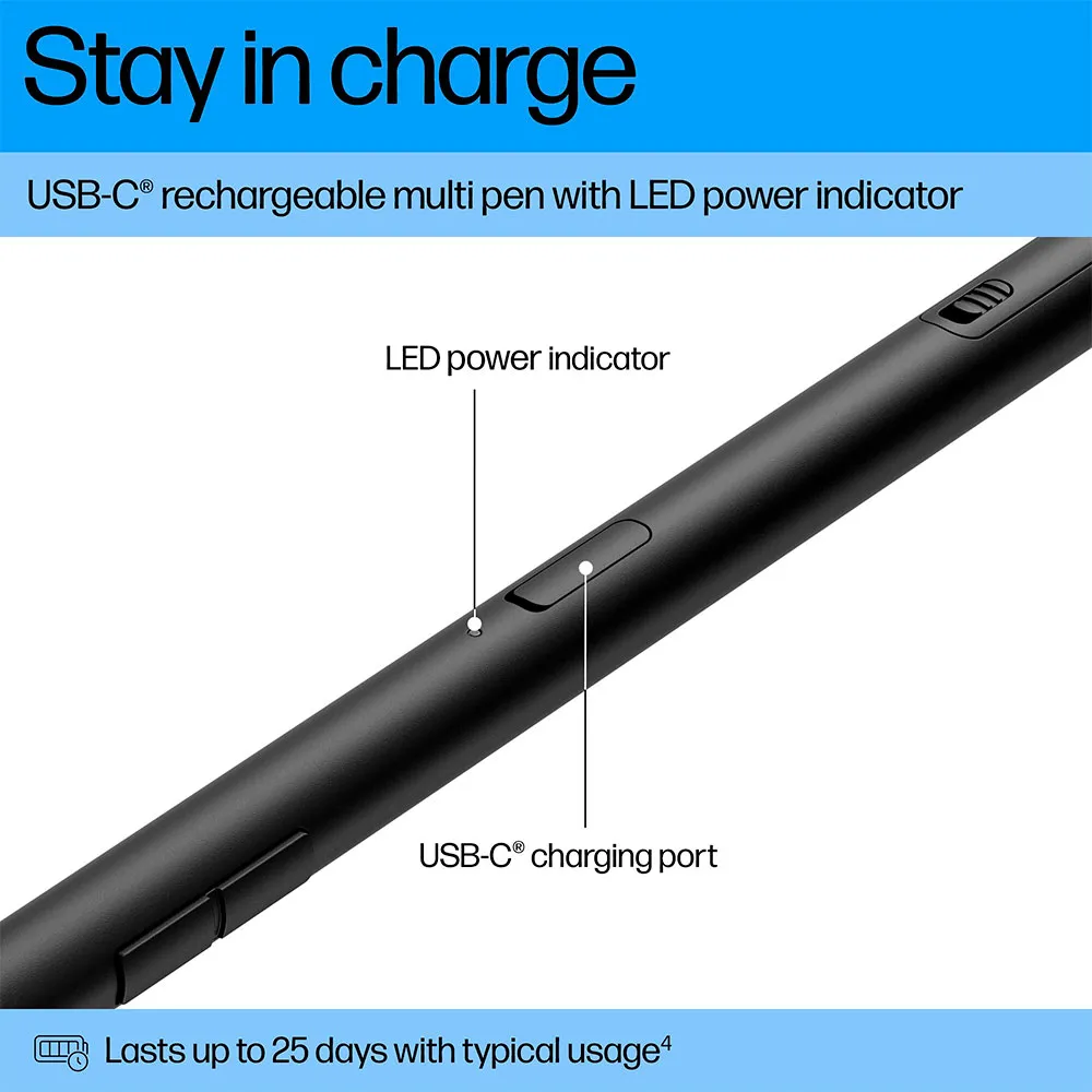 Sempre no ponto. Para compatibilidade perfeita entre dispositivos, a Caneta Multi Recarregável HP 700 está sempre pronta para ajudar. Trabalhe naturalmente em vários protocolos , com recursos de controle precisos e personalização intuitiva de botões que fazem cada tarefa exatamente como você pede. Caneta Multi Recarregável HP 700. Compatibilidade do dispositivo: Universal, Compatibilidade da marca: HP, Cor do produto: Preto. Peso: 13 g, Largura: 9 mm, Profundidade: 9 mm. Largura da embalagem: 76 mm, Profundidade da embalagem: 168 mm, Altura da embalagem: 30 mm. Em projetos ou dispositivos, esta caneta multi intuitiva alterna de protocolo para protocolo tão facilmente quanto escreve . O controle preciso da ponta oferece o conforto de uma experiência de escrita mais suave e natural que desliza pelas cargas de trabalho . Conheça a caneta multi faz-tudo construída em torno de você. Botões personalizáveis trazem suas funções favoritas diretamente para a ponta dos seus dedos. Inclinação e pressão ajustáveis com novas pontas macias e duráveis significam um toque mais pessoal para mais produtividade. Não deixe nada por escrever com a caneta recarregável USB-C® que mantém você editando, projetando, fazendo anotações e muito mais com confiança por até 25 dias com uso típico . Um indicador LED conveniente rastreia seu status de carregamento para que você sempre saiba que está pronto para usar. A melhor escolha para um amanhã mais brilhante, a Caneta Multi Recarregável HP 700 é feita com pelo menos 60% de materiais reciclados pós-consumo . Além disso, com embalagem com certificação FSC® , esta caneta foi projetada cuidadosamente.