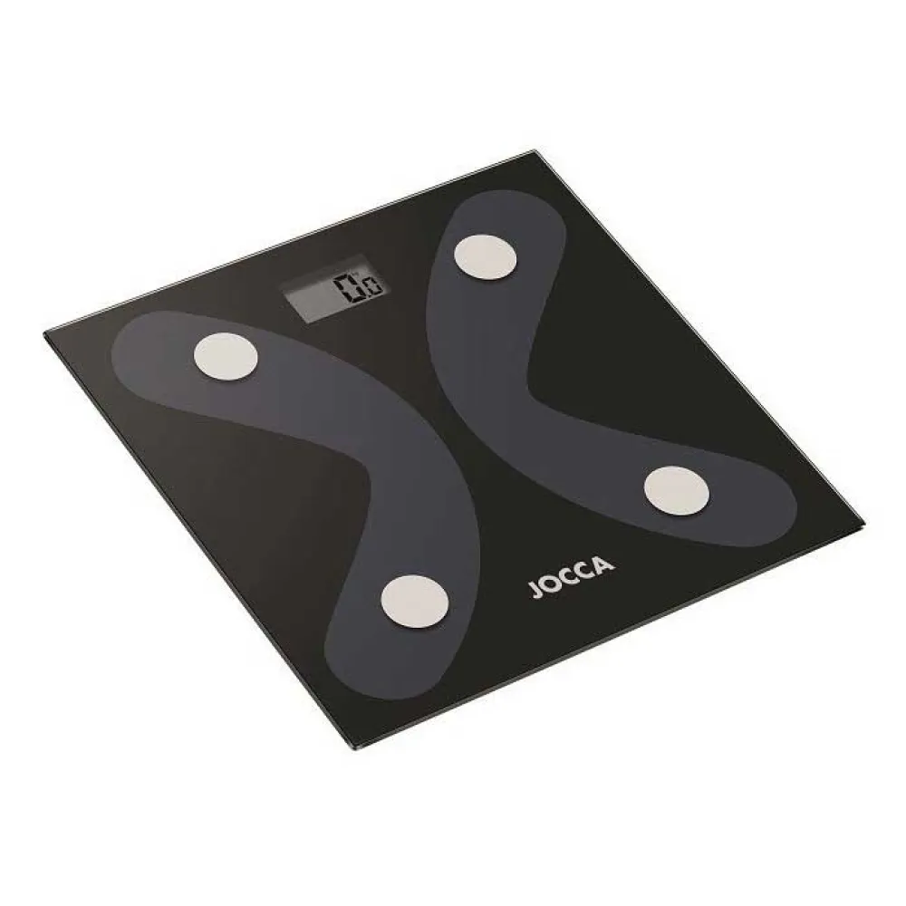 A balança Jocca Bluetooth 4.0 é feita de vidro temperado com dois grandes pontos de contato para máxima precisão na determinação da porcentagem de gordura corporal, água corporal, massa muscular, óssea, IMC, calorias, gordura visceral e peso que você pode controlar através de um aplicativo móvel ou App.