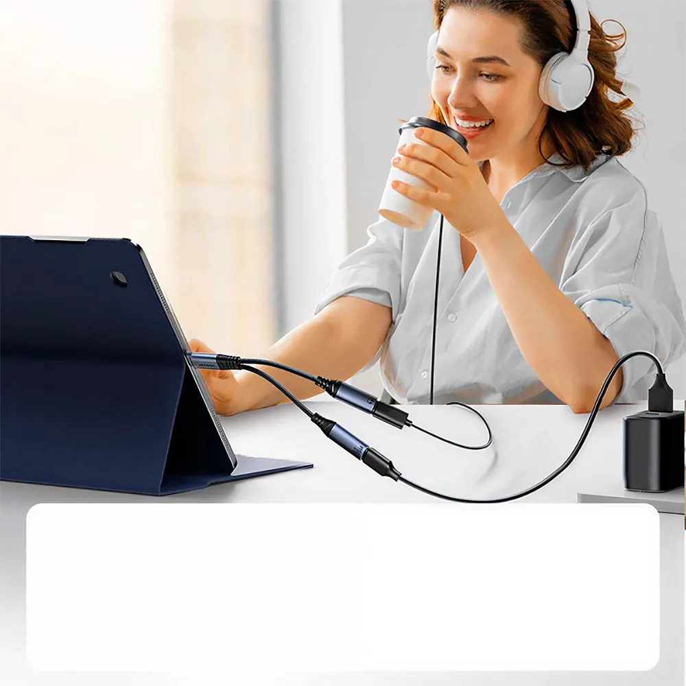 Adaptador USB Tipo-C para USB Tipo-C Duplo. Permite que o dispositivo carregue e reproduza música simultaneamente. Também possui um conversor DAC digital-analógico. Este adaptador não é compatível com os modelos iPhone 15/ 15 Plus/ 15 Pro/15 Pro Max.