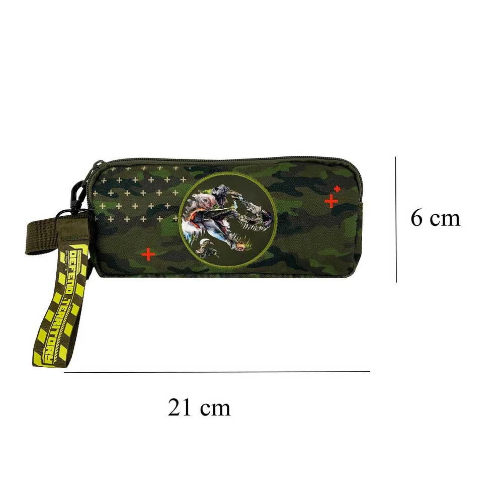 Este é o Estojo Duplo Multiuso do Mundial Jurássico. Sua estrutura versátil de dois bolsos o torna a solução perfeita para uma infinidade de necessidades de armazenamento além de artigos de papelaria. Use-o como uma nécessaire de viagem compacta para produtos de higiene pessoal, um suporte seguro para seus acessórios de tecnologia, como cabos de carregamento e fones de ouvido, ou um estojo portátil para pequenos brinquedos e colecionáveis. Para artistas em movimento, é uma maneira ideal de organizar pincéis, bastões de carvão e outras ferramentas criativas essenciais. Sua construção durável é construída para suportar os rigores do uso diário, tornando-o um companheiro confiável para qualquer missão. Especificações Técnicas:
