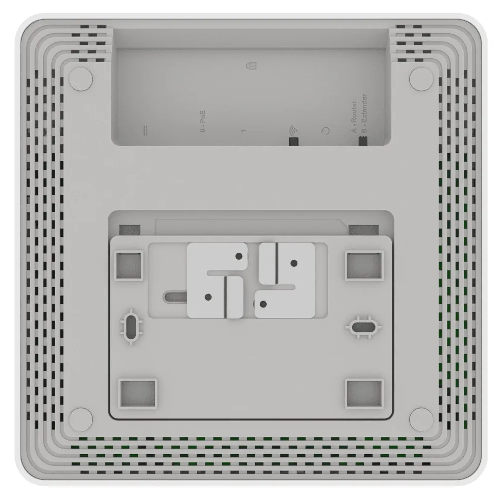 Montagem na parede ou no teto: Este dispositivo Keenetic pode ser colocado em uma superfície plana ou fixado em uma parede ou teto sólido usando o kit de montagem fornecido, também pode ser instalado em tetos suspensos usando o kit de montagem junto com clipes de trilho em T.