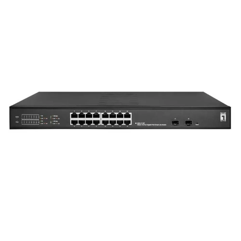 LevelOne Hilbert Switch Smart Lite Gigabit PoE de 18 portas, 16 saídas PoE, 2 x Gigabit SFP, 802.3at/af PoE, orçamento de energia PoE de 230W.