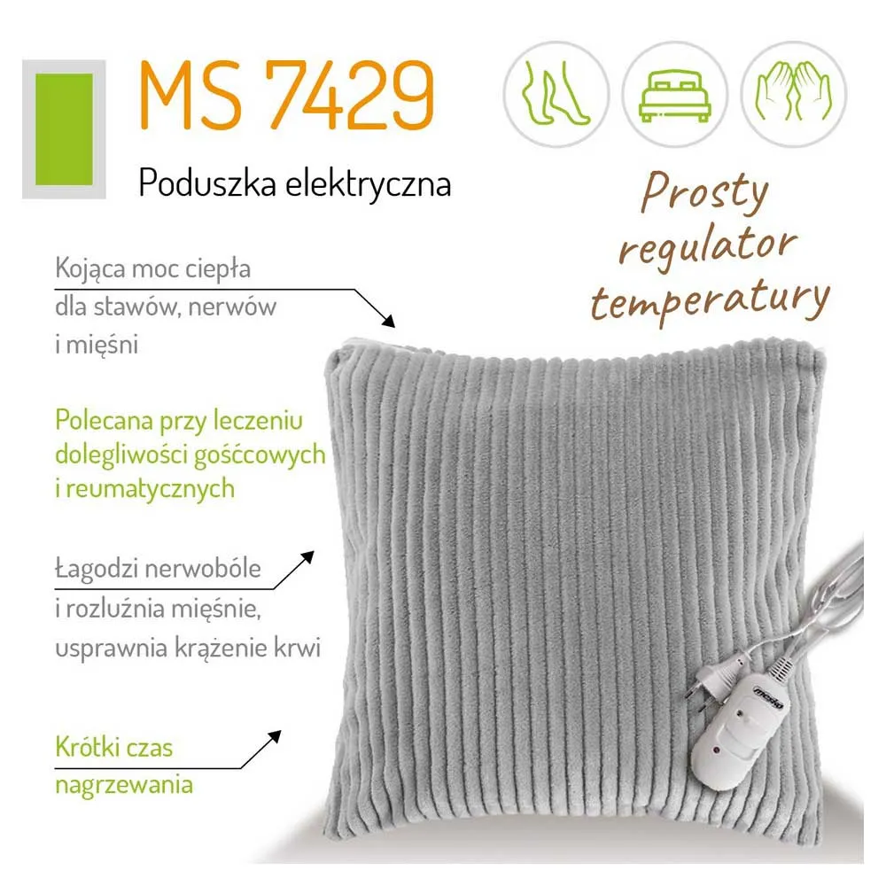 Quando presenciamos dias mais curtos e frios, muitas vezes procuramos uma maneira de tornar nossas noites em casa mais confortáveis. Vento forte e baixas temperaturas também são fatores que influenciam nossos problemas de saúde, como problemas de sono, reumatismo ou ciática. Nessas situações, uma almofada elétrica MS 7429 com dimensões de 38 cm x 38 cm será útil. A almofada possui um orifício para mãos ou pés.