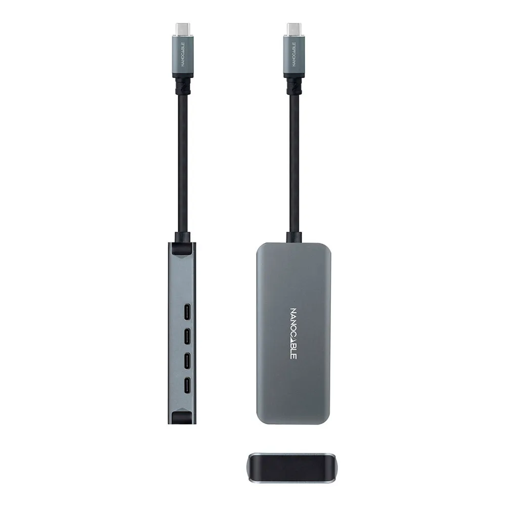 Hub USB-C USB3.2 GEN 1 macho em uma extremidade e 4 portas USB3.2 GEN 1 Tipo C fêmea na outra.