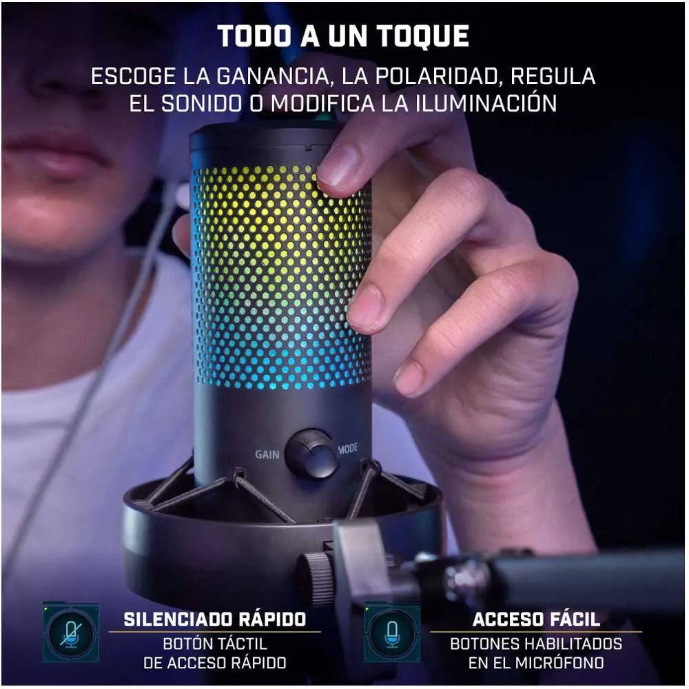 O novo microfone de mesa Apholos, com sua performance de estúdio de gravação, é projetado para fornecer transmissão de áudio profissional. Graças aos seus quatro padrões de captação selecionáveis, está preparado para dar clareza e clareza vocal aos seus podcasts, jogos, streaming, ASMR e inúmeras atividades. Desfrute do microfone mais completo, com controles diretos de fácil acesso, incluindo o botão de mudo do microfone sensível ao toque, e seu efeito de luz ambiente com 5 cores selecionáveis.
