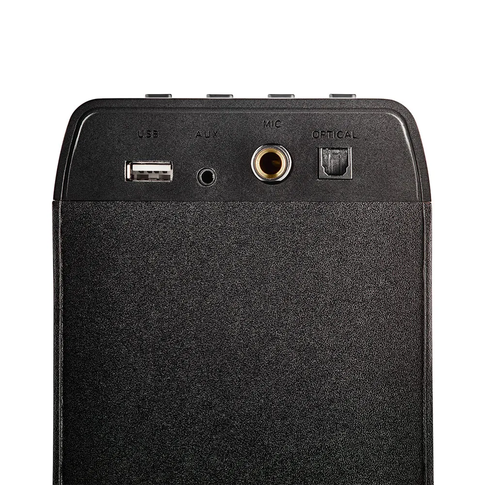 Oferece várias opções de conectividade, incluindo uma entrada óptica para conexão de TV, porta USB, rádio FM e entrada de áudio auxiliar.