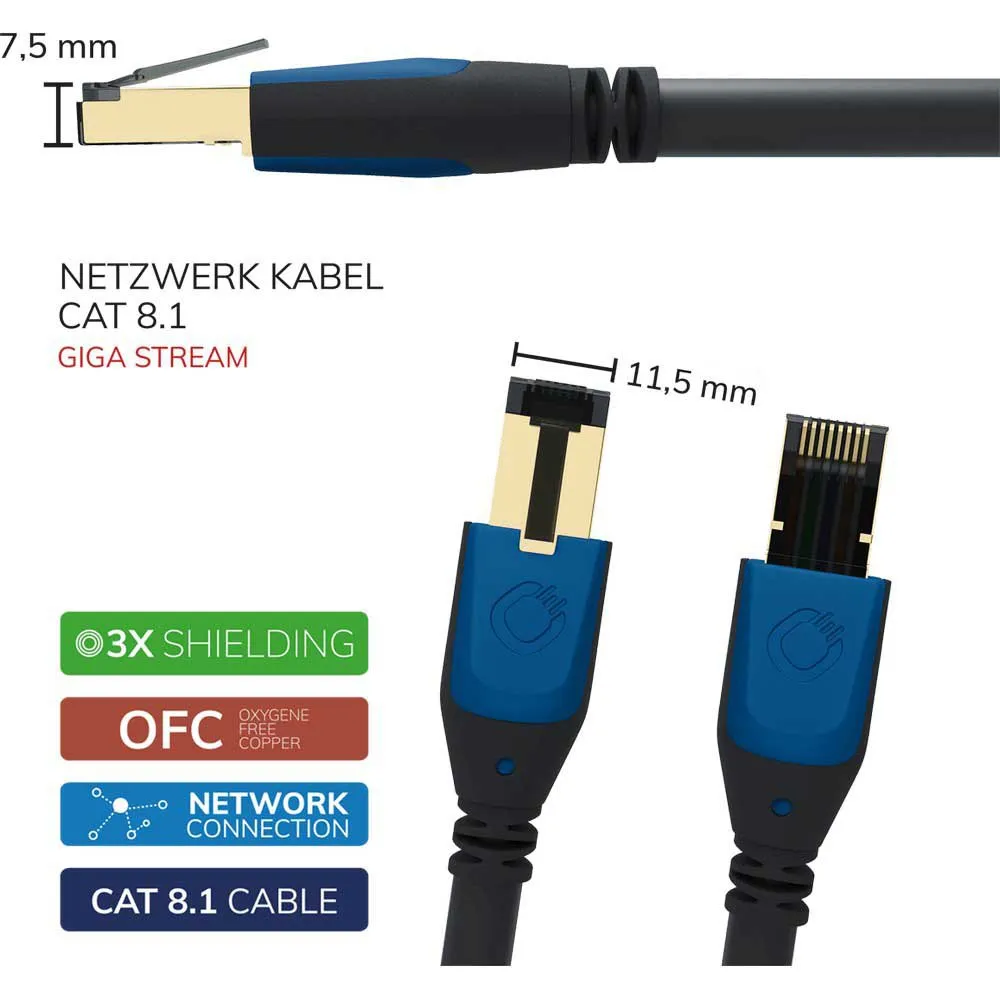 O cabo de rede de desempenho para conexões Ethernet com até 40 Gbit/S. Entre na pista rápida para jogos e outras conexões de rede com este cabo de rede Cat 8.1. Oferece mais de duas vezes a largura de banda de gerações anteriores de cabos. Basta conectá-lo e aproveitar o turbo de dados: o cabo de rede Oehlbach Giga Stream é 100% compatível com outros componentes de entretenimento e rede com conectores Rj 45 e categorias Cat 6, 6a ou 5. O condutor de par trançado blindado blindado triplo feito de cobre livre de oxigênio sempre garante excelente desempenho no cabo Giga Stream. Com plugues conectores banhados a ouro de 24 quilates, o Giga Stream também exibe uma aparência totalmente acabada e 100% de confiabilidade de contato.