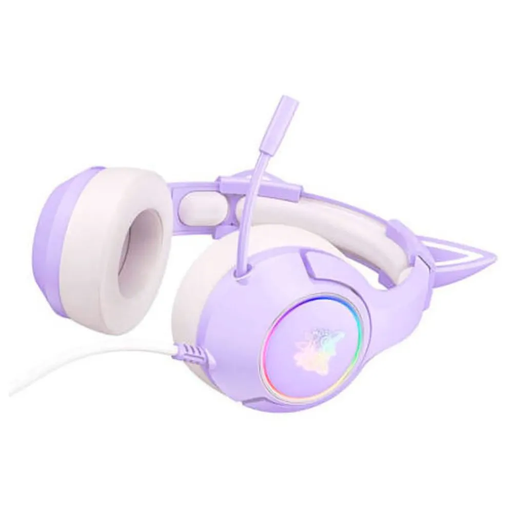 ONIKUMA K9, fones de ouvido gamer com microfone omnidirecional, iluminação RGB, design de orelhas de gato e compatibilidade multiplataforma, na cor roxa.