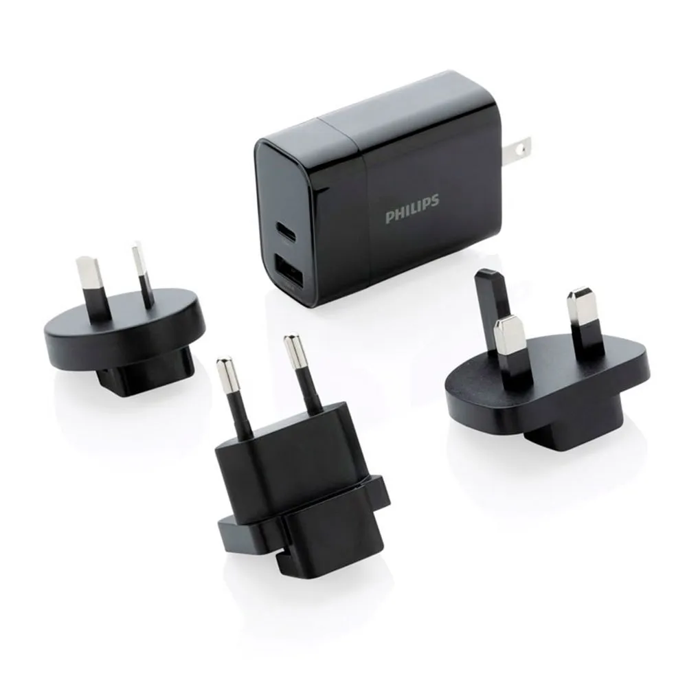 Carregador de viagem ultra rápido com acessórios philips. inclui adaptadores de tomada internacionais aus, uk, ue, us. 2.4a. carga rápida de 30w. usb tipo c.
