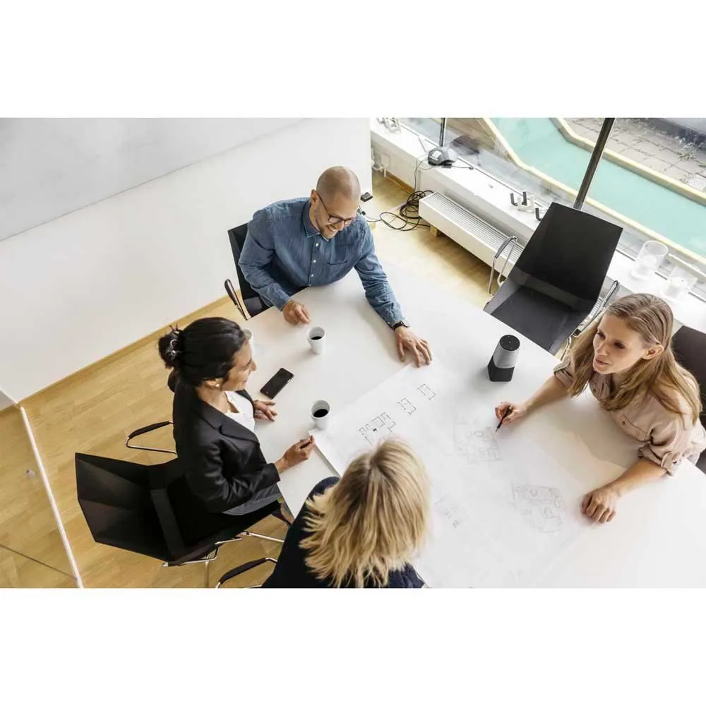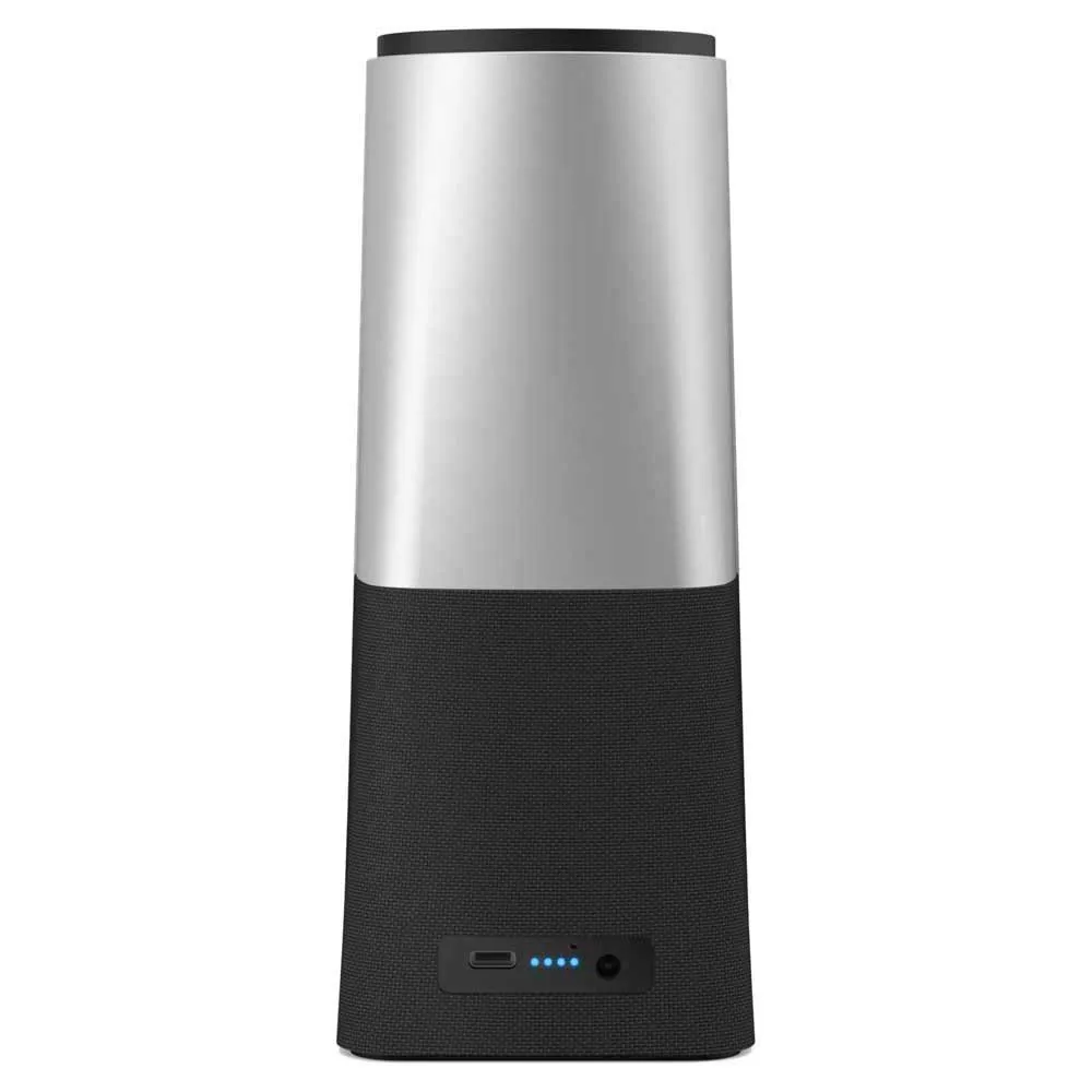 O microfone vem com um microfone de 4 matrizes com cancelamento de ruído para capturar um raio de 6 metros e até 6 alto-falantes ao redor da mesa.