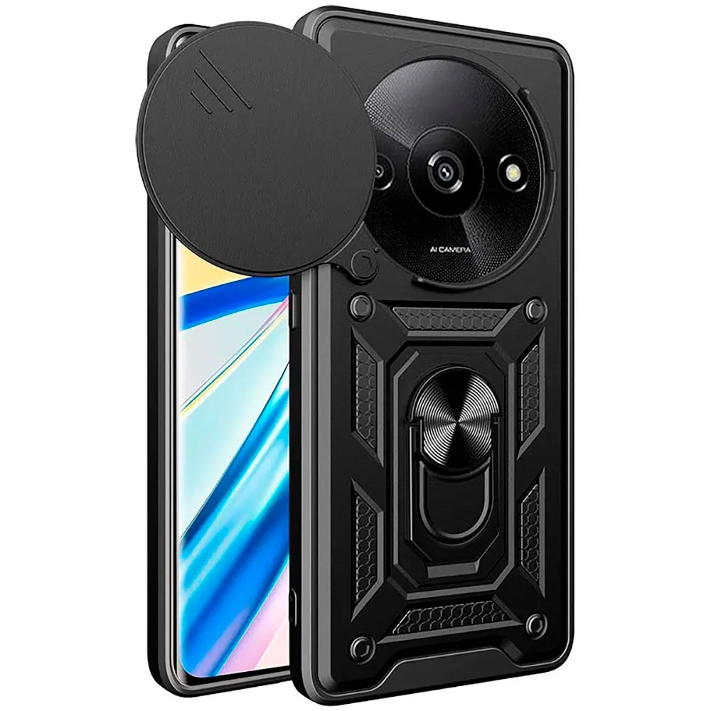 Capa Militar Preta para Xiaomi Redmi A3 / Poco C61 com proteção de câmera, suporte magnético e anel.