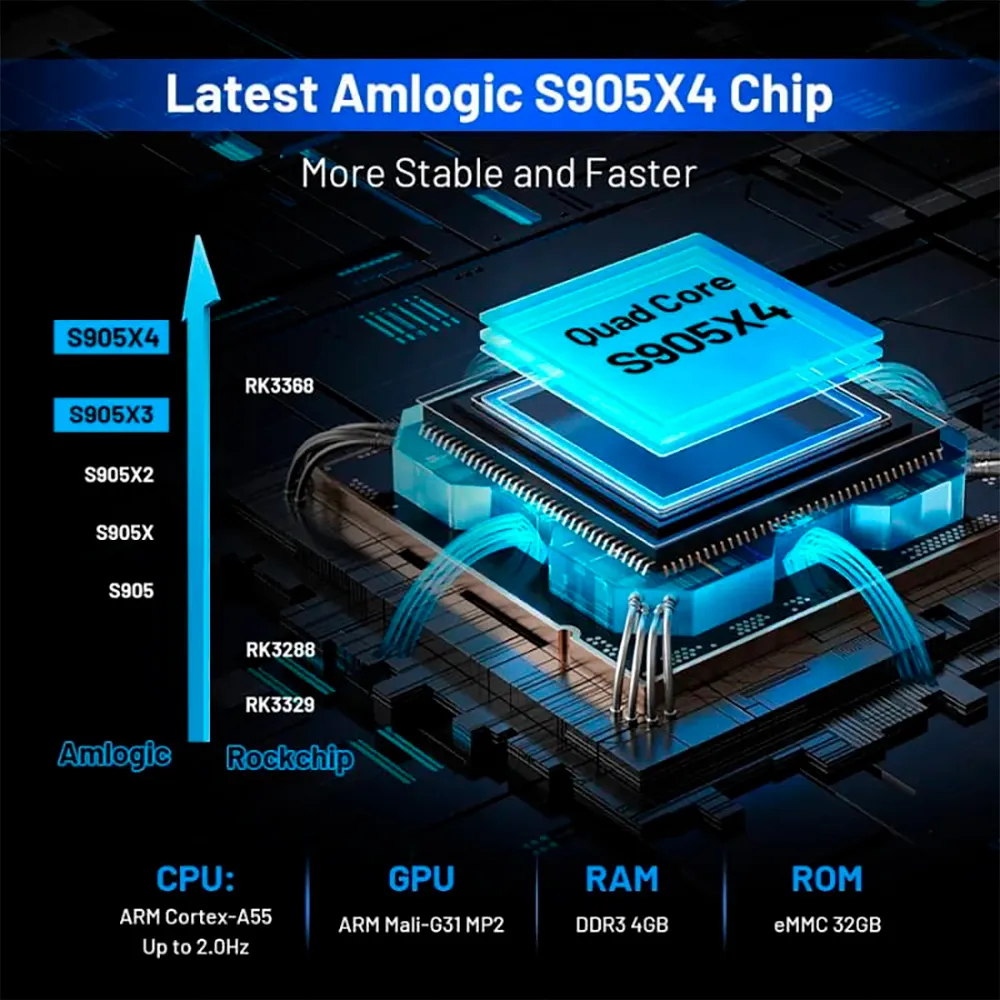 The integrated Amlogic S905X4 processor ensures a smooth and stable gaming experience, even decoding video up to 4K.