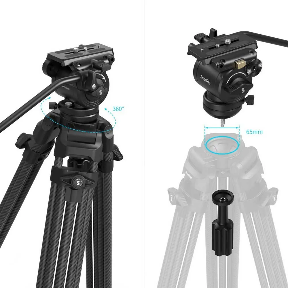 O tripé é equipado com uma cabeça fluida de liga de alumínio projetada com precisão que suporta uma capacidade de carga útil de 10kg (22.05lb).