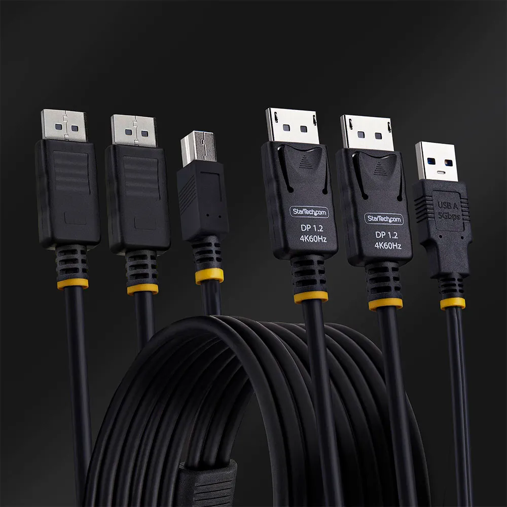 Combine duas conexões DisplayPort 4K 60Hz e uma USB 5Gbps em um único cabo para conectar um computador a um switch KVM. O cabo KVM fornece uma conexão confiável entre um computador e um switch KVM DisplayPort de monitor duplo com suporte a USB 5Gbps. Gerencie cabos com facilidade. Simplifique o gerenciamento de cabos combinando várias conexões em um único feixe. Isso minimiza o número de cabos individuais que precisam ser manuseados, tornando a instalação mais rápida e eficiente. Eles são perfeitos para ambientes onde KVMs são essenciais, como data centers, salas de servidores, redes de borda e configurações de gerenciamento remoto, ajudando a reduzir a desordem de cabos e manter um espaço de trabalho organizado. Funciona com qualquer switch KVM. Este cabo KVM funciona com qualquer sistema operacional, incluindo Windows, macOS, ChromeOS e Linux. Ele também suporta todas as principais plataformas de hardware, como Intel, AMD e Apple Silicon. O cabo combo KVM é compatível com DisplayPort 1.2, suportando resoluções de até 4K a 60Hz, HDR10 e áudio DisplayPort para uma experiência de áudio/vídeo de alta qualidade. O conector USB 3.0 Tipo-A para Tipo-B fornece velocidades rápidas de transferência de dados de até 5Gbps. A Vantagem: Cabo KVM Dual-DisplayPort e USB 5Gbps de 1.8 m (6 pés), 4K 60Hz, Cabo Combo DP 1.2/USB 3.0 universalmente compatível para Switches KVM de Monitor Duplo. Comprimento do cabo: 1.8 m, Tipo de porta do teclado: USB, Tipo de porta do mouse: USB. Certificados de conformidade: RoHS. Peso: 320 g, Largura da embalagem: 290 mm, Profundidade da embalagem: 145 mm. Largura da caixa master (externa): 400 mm, Comprimento da caixa master (externa): 300 mm, Altura da caixa master (externa): 300 mm. CABO COMBO KVM: Conecte um computador a um switch KVM DisplayPort de monitor duplo com suporte a USB 5Gbps.