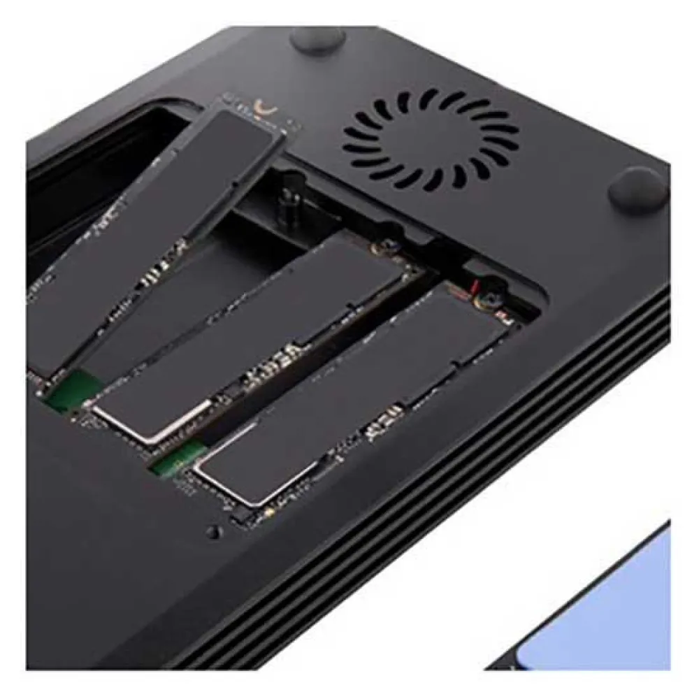 O gabinete de metal ventilado possui almofadas térmicas e um ventilador de refrigeração para garantir que seus SSDs estejam operando em temperaturas ideais