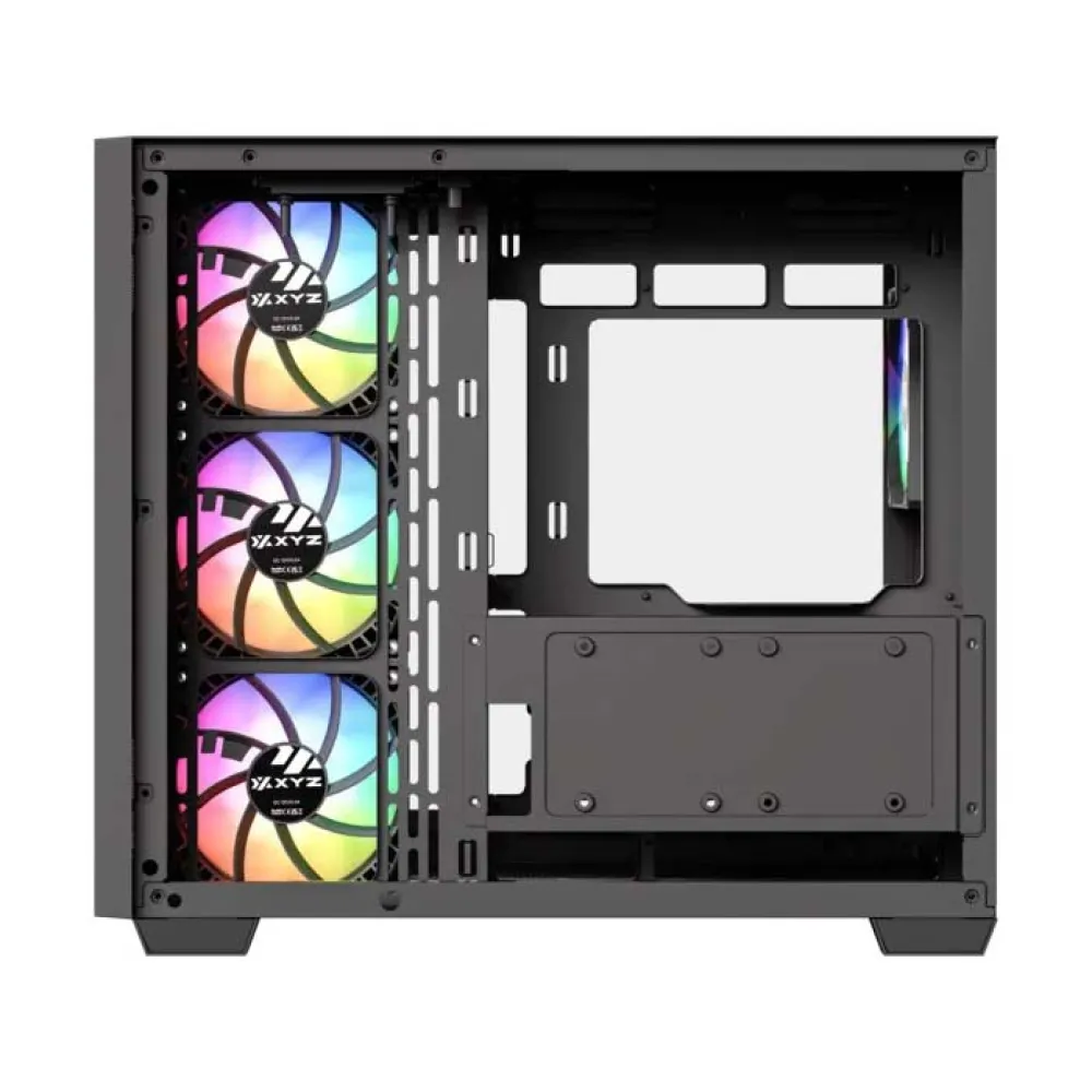 O XYZ Qubex simplifica o processo de construção com seu interior espaçoso e inteligentemente projetado. Seu formato grande oferece ampla folga para as placas gráficas carro-chefe mais recentes e coolers de ar de CPU altos, eliminando preocupações de compatibilidade. O sistema de gerenciamento de cabos dedicado, com canais de roteamento estrategicamente posicionados, pontos de amarração e uma quantidade generosa de espaço atrás da bandeja da placa-mãe, torna a obtenção de uma construção limpa e com aparência profissional fácil. Os painéis laterais sem ferramentas e as gaiolas de unidade modulares aprimoram ainda mais a experiência amigável, permitindo acesso rápido e modificações fáceis de hardware.