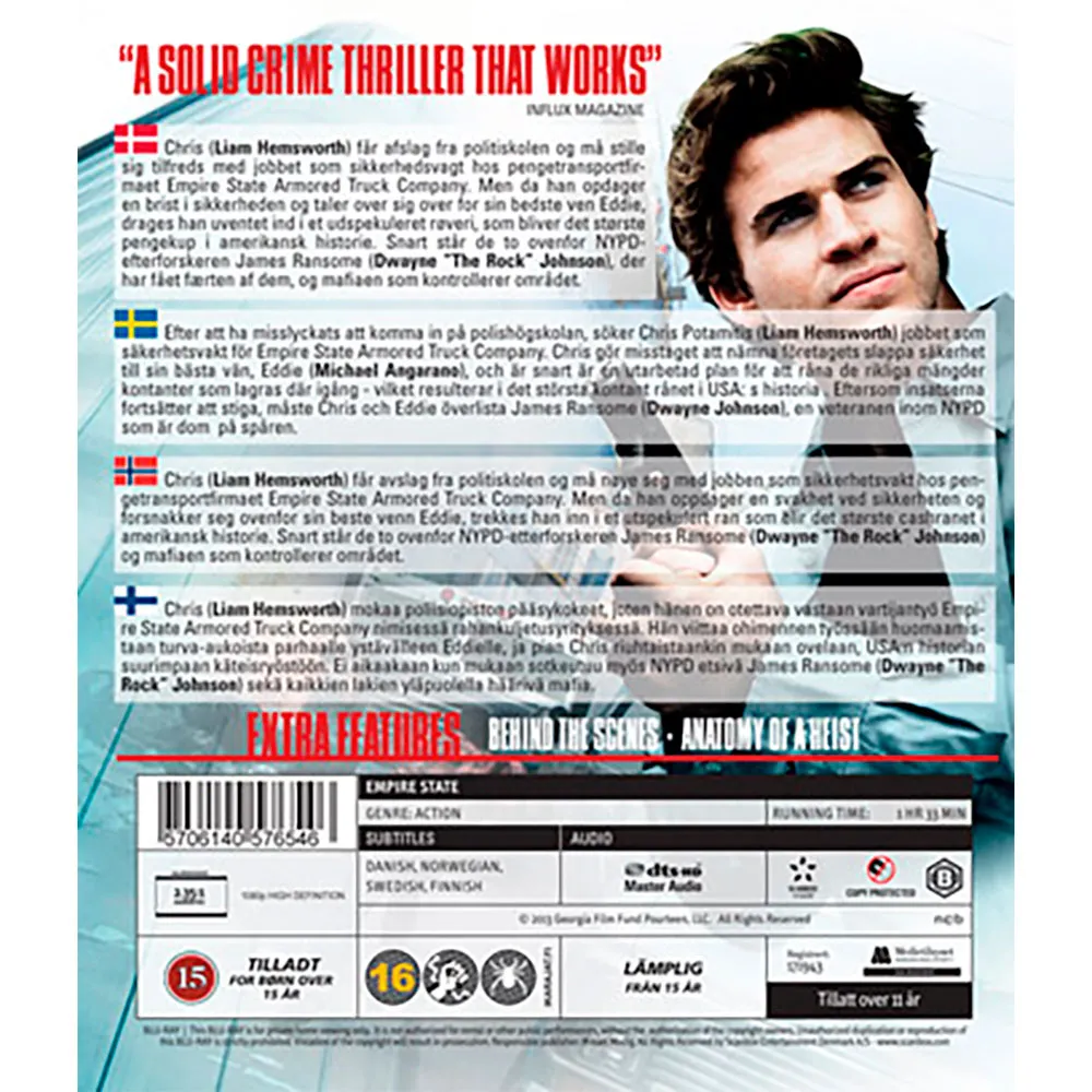Станьте свидетелем истории Криса Потамитиса (Лиам Хемсворт), молодого охранника инкассаторской компании, который совершает роковую ошибку. Когда он упоминает о слабой охране компании своему лучшему другу, Эдди (Майкл Ангарано), он невольно приводит в действие дерзкий план кражи миллионов. По мере того, как план выходит из-под контроля, два друга оказываются под прицелом как мафии, так и настойчивого детектива полиции Нью-Йорка, Джеймса Рэнсона (Дуэйн Скала Джонсон), который ни перед чем не остановится, чтобы привлечь их к ответственности. Ощутите каждое напряженное противостояние, захватывающую погоню и драматическую конфронтацию с кристально чистым изображением и захватывающим звуком, которые может обеспечить только Blu-ray. Это издание, представленное на языке оригинала, оживляет аутентичные диалоги и пульсирующий саундтрек в вашем домашнем кинотеатре.