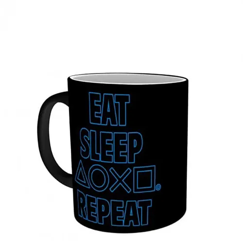 Dynamisk värmefärgskiftande design: Muggen förvandlas magiskt när en varm vätska tillsätts, och avslöjar de klassiska PlayStation-symbolerna och texten "Eat Sleep Repeat".