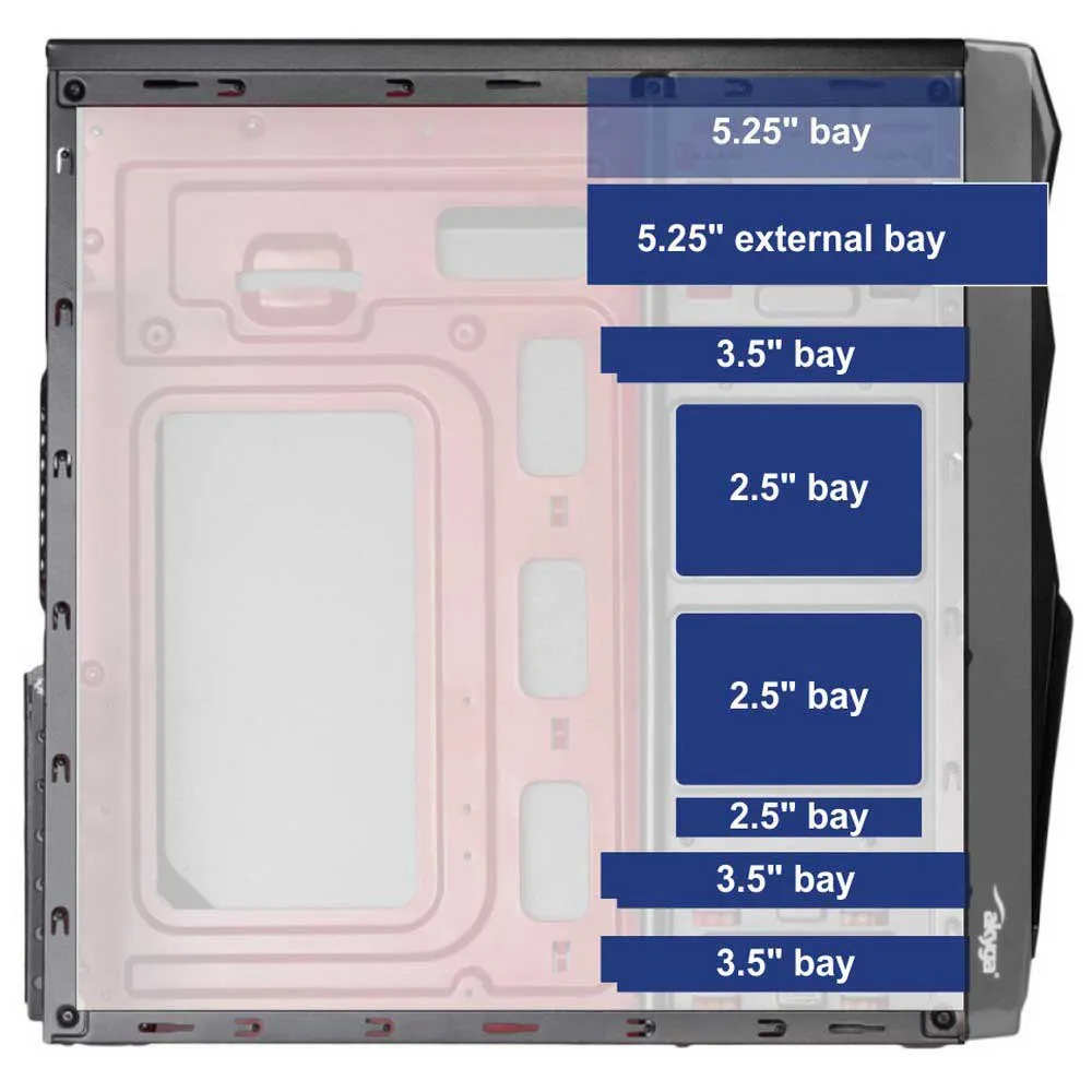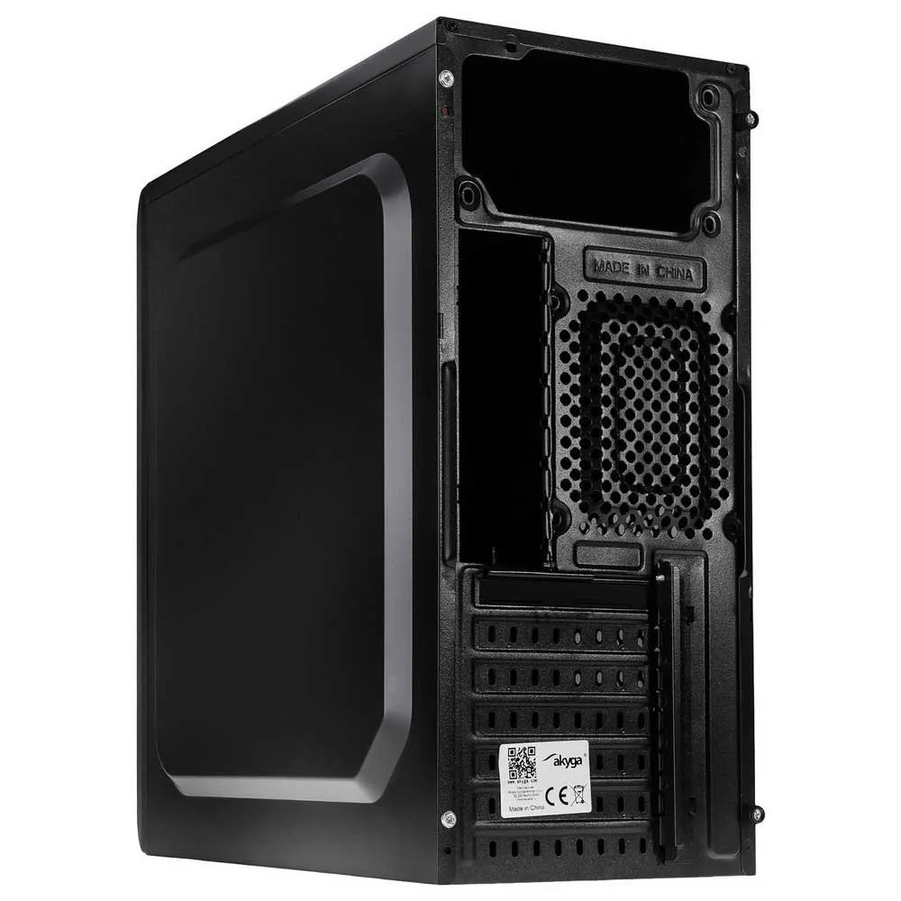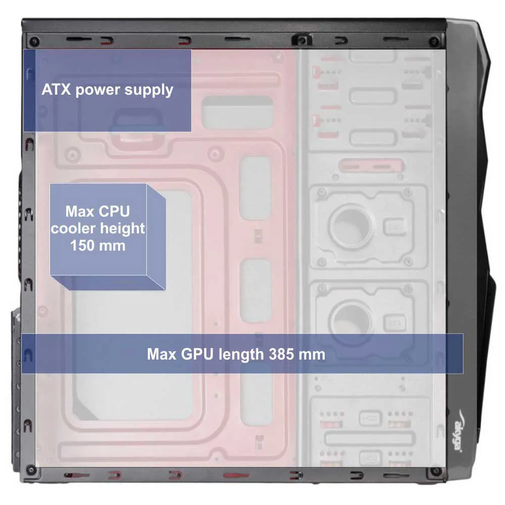 Akyga® AK995BK är ett Midi ATX-fodral, lämpligt för spelare såväl som hem eller kontor. Fodralet passar Micro ATX, Mini ITX, Flex ATX eller standard ATX moderkort. Placerat på det övre 5.25´´ externa facket kan du montera en CD / DVD-enhet eller brännare. Inuti finns tre 2,5´´ fack, tre 3,5 b fack (konverterbara till 2,5 ´´) och en 5,25 bay fack, vilket ger totalt 7 fack för montering av skivor och enheter. Kabelhanteringssystemet underlättar installationen av komponenter medan rymlig interiör möjliggör långa grafikkort upp till 385 mm långa. Fodralet gör det möjligt att installera två fläktar: sida (12 cm) och bak (12 cm). CPU-kylsystemets maximala höjd är 150 mm. Kylning gynnas också av en frontpanel nästan helt av stålnät. Detta innebär att luftcirkulationen (med eller utan fläktar) är mycket bättre än i helt slutna fall, och detta ger svalare förhållanden för viktiga komponenter, vilket säkerställer deras stabila drift under längre tid. På frontpanelen finns två USB 2.0 som är perfekta för att ansluta trådlösa möss, tangentbord, externa lagringsmedier eller andra enheter. Ingångarna för hörlurar och mikrofoner ligger precis bredvid, vilket ger snabb och enkel åtkomst för kringutrustning.