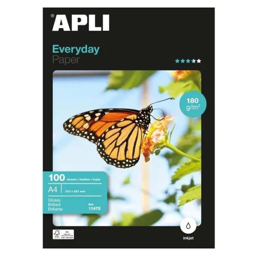 Vardagsfotopapper A4-storlek. 180 g/m² papper med en blank finish. Varje förpackning innehåller 100 ark. Behandlingen som detta papper får i de olika skikten överförs till bilderna som vi skriver ut större ljusstyrka och skärpa, samtidigt som man undviker att pappret krullas. Särskilt lämplig för stora fotografiska utskrifter, underlag med mycket bildinnehåll, e-post och Internet. Lämplig för användning i bläckstråleskrivare.