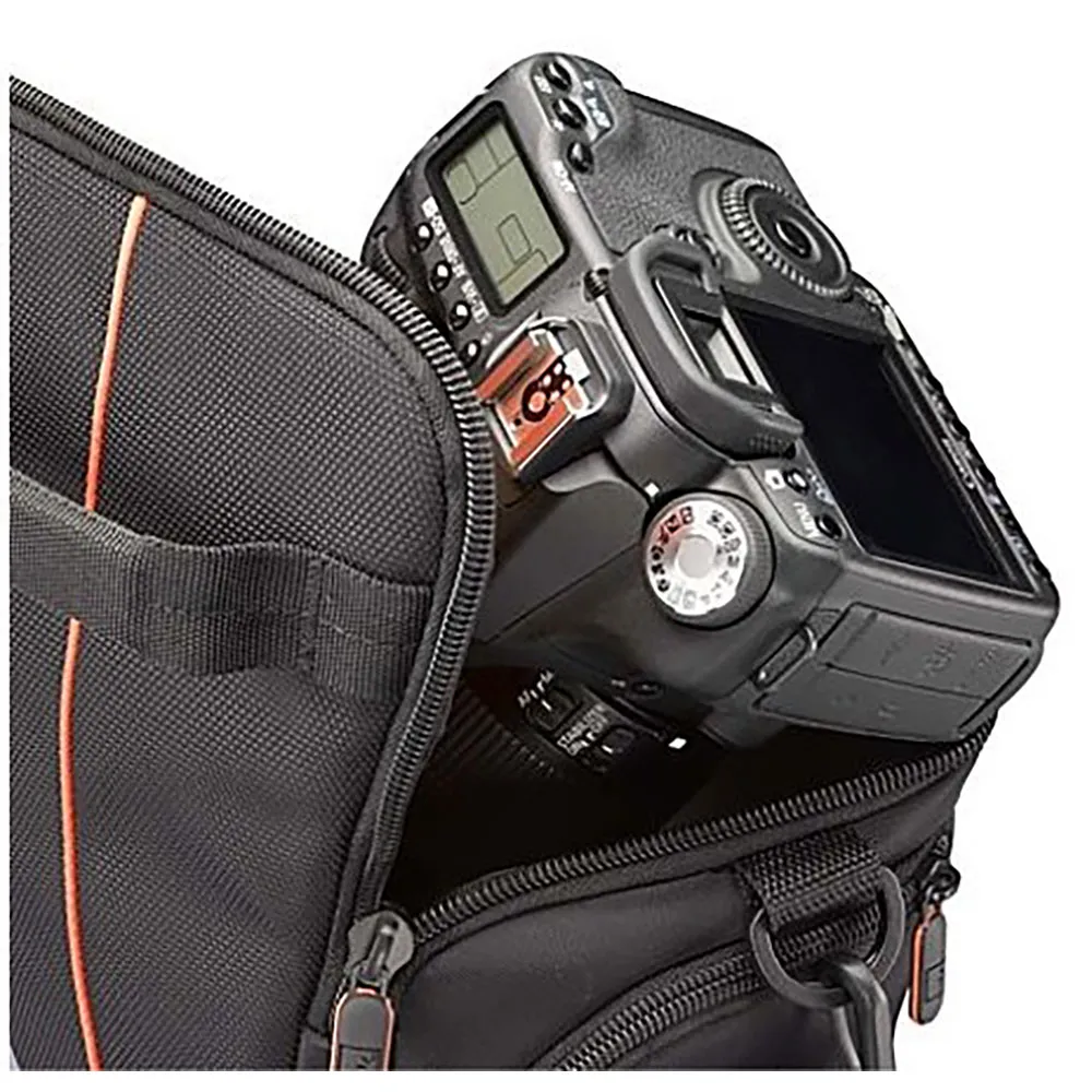 - Perfect fit for SLR with standard lens attached (kit lens) - Longer zippered opening allows for easier access to camera - Separate side pockets for battery, cables or lens cap storage - Internal, zippered pocket for SD card or filter storage - Belt loop and removable shoulder strap for easy transport.