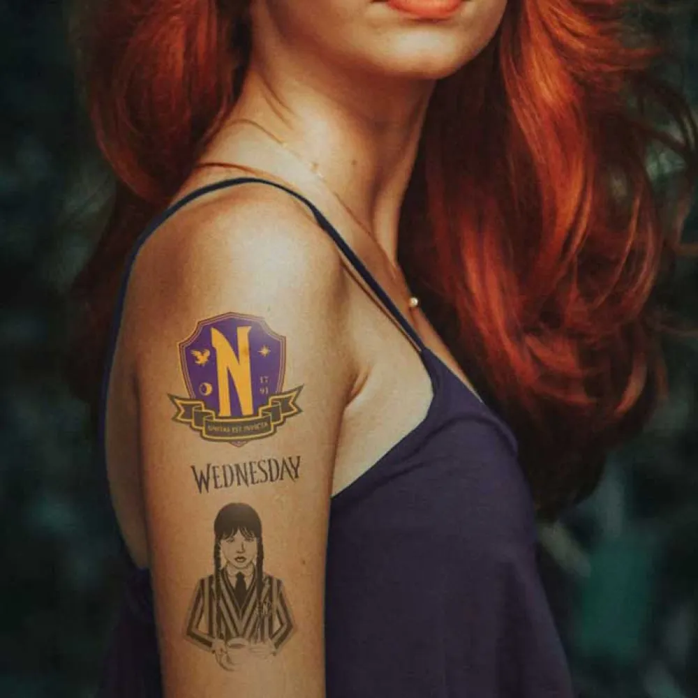 Denna temporära tatuering är också en fantastisk present till alla Wednesday Addams-entusiaster. Överraska dina vänner och medfans med en unik och omtänksam present som hyllar deras gemensamma kärlek till den ikoniska karaktären. Det är en present som går bortom det vanliga och erbjuder en konkret koppling till Wednesdays värld och en chans att förkroppsliga hennes fängslande persona.