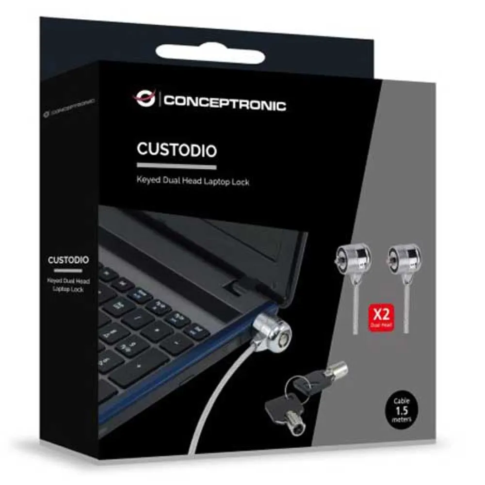 Notebook-säkerhetslåset skyddar bärbara datorer mot stöld*. Låset passar alla bärbara datorer med en säkerhetsanslutning. Fäst bara den 1.5 meter långa kabeln på ett fast föremål (t.ex. ett bord) och anslut den till den bärbara datorn. Inklusive 2 nycklar. Produkten fungerar stöldfördröjande, den förhindrar inte stöld. Conceptronic kan inte hållas ansvarigt vid stöld eller skada.