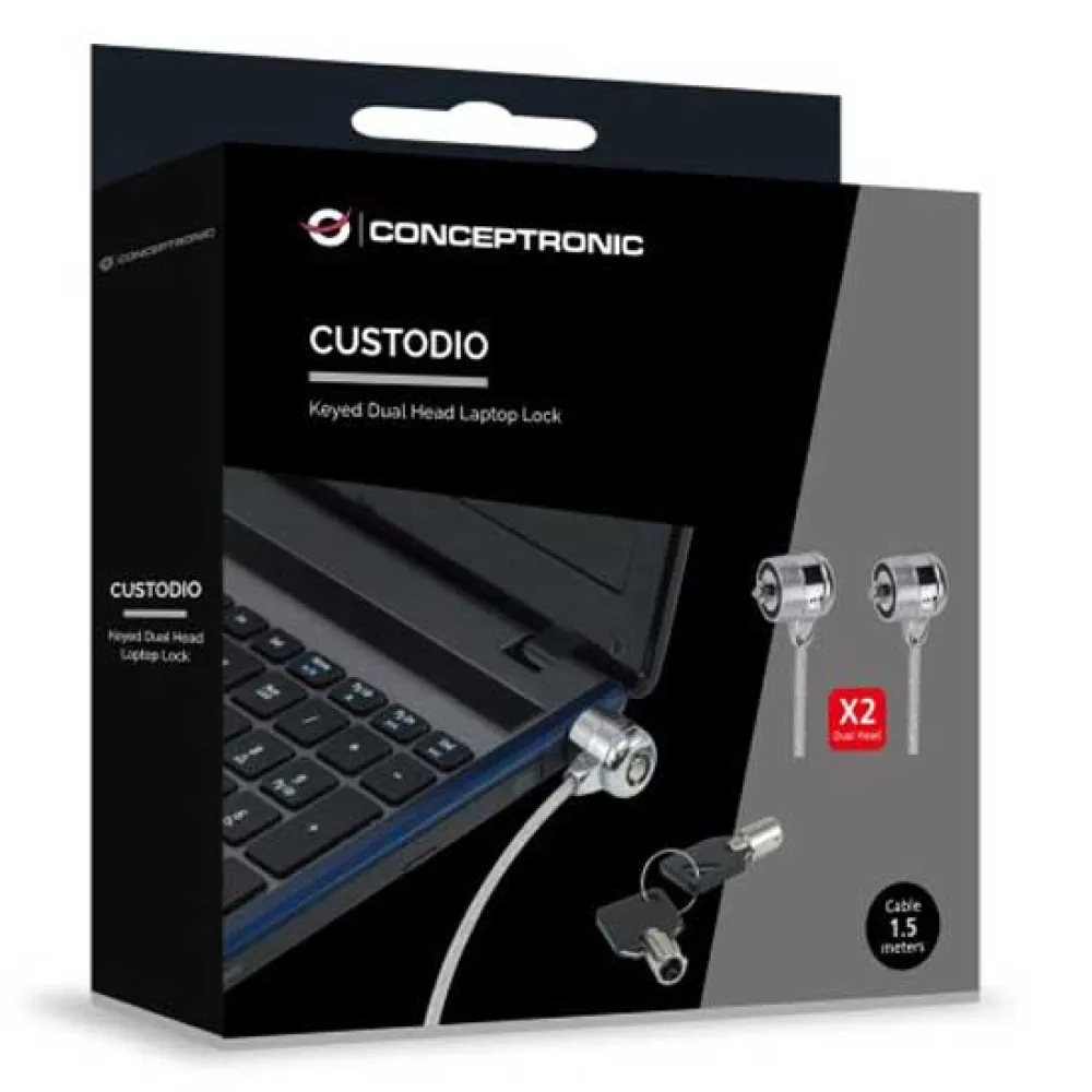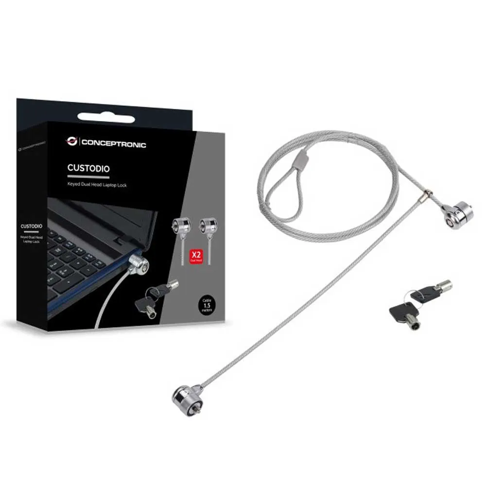 Med det dubbla huvudlåset för bärbara datorer kan du enkelt säkra två enheter. Det nyckellåsta dubbla huvudlåset för bärbara datorer skyddar bärbara datorer mot stöld*. Detta lås är kompatibelt med alla enheter som har en säkerhetsanslutning. Fäst helt enkelt den 1.5 meter långa kabeln i ett stabilt föremål, t.ex. ett bord, och anslut den till dina två enheter. Förpackningen innehåller 2 nycklar för extra bekvämlighet. Produkten fungerar som stöldfördröjande, den förhindrar inte stöld. Conceptronic kan inte hållas ansvarigt vid stöld eller skada.