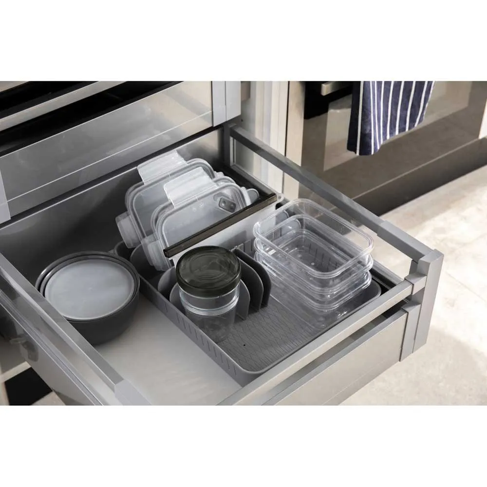 Denna organisatör är designad med tre stora och tre små justerbara avdelare och är perfekt för att separera matbehållare med locken på eller av.