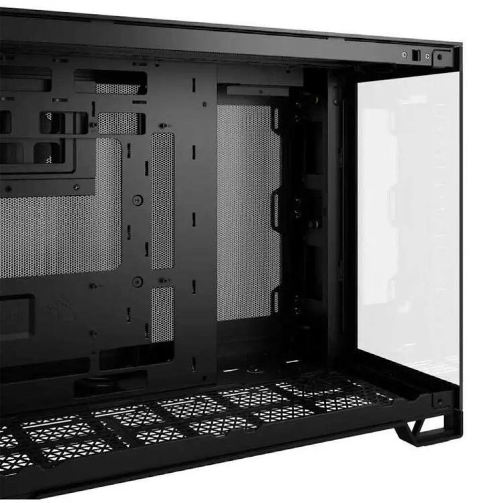 2500D:s eleganta och minimalistiska design integreras sömlöst i alla moderna miljöer. Den solida frontpanelen ger en ren estetik samtidigt som den döljer dina enheter och kablar, medan den stora sidopanelen i härdat glas visar upp din byggen i all sin glans.