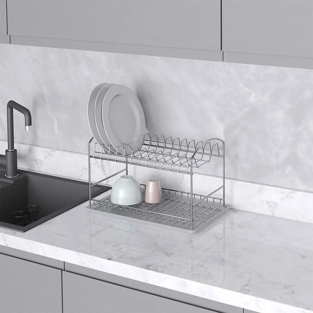 Dish drainer för disk med två hyllor och droppbricka i stål och plastbricka. Den förbättrar och optimerar arrangemanget av disk och glas i köket. Ingen installation krävs.