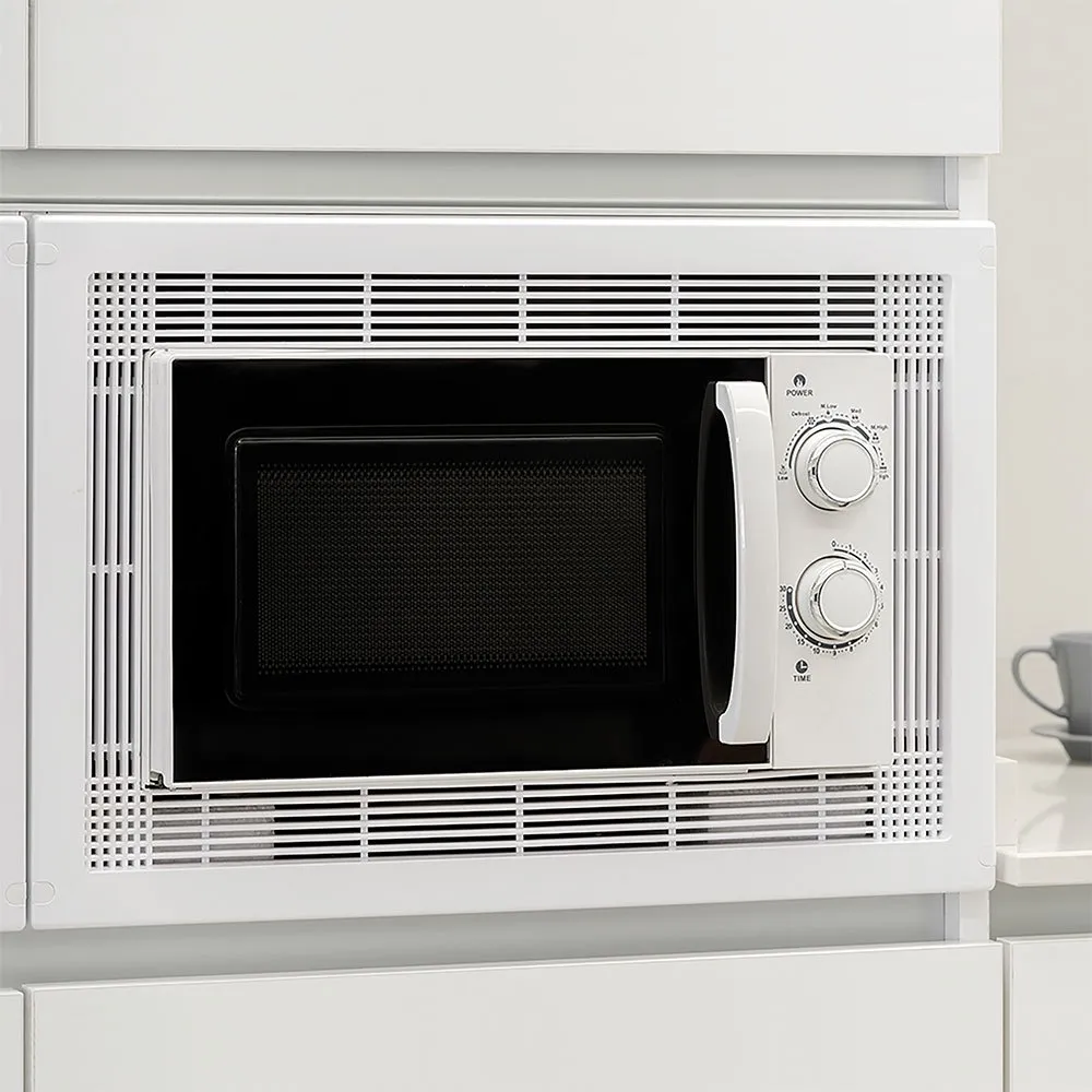 Ram för inbyggnad av mikrovågsugn i en 600 mm bred köksenhet av plast, med 3 tillgängliga ytbehandlingar: injicerad med vit, målad metallicgrå eller med en elektrolytisk satinnickelbeläggning (liknande rostfritt stål). Den har en försvagad hylla för att skära den och justera enheten, så att mikrovågsugnen är helt integrerad i möbeln. Enkel att installera, inkluderar allt som behövs för montering: fästskruvar, täcklock för att dölja skruvarna och 4 block för att placera mikrovågsugnen på rätt höjd.